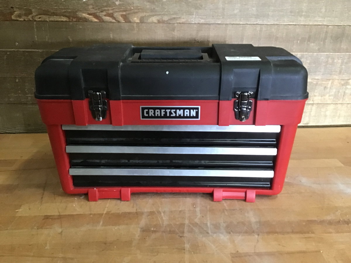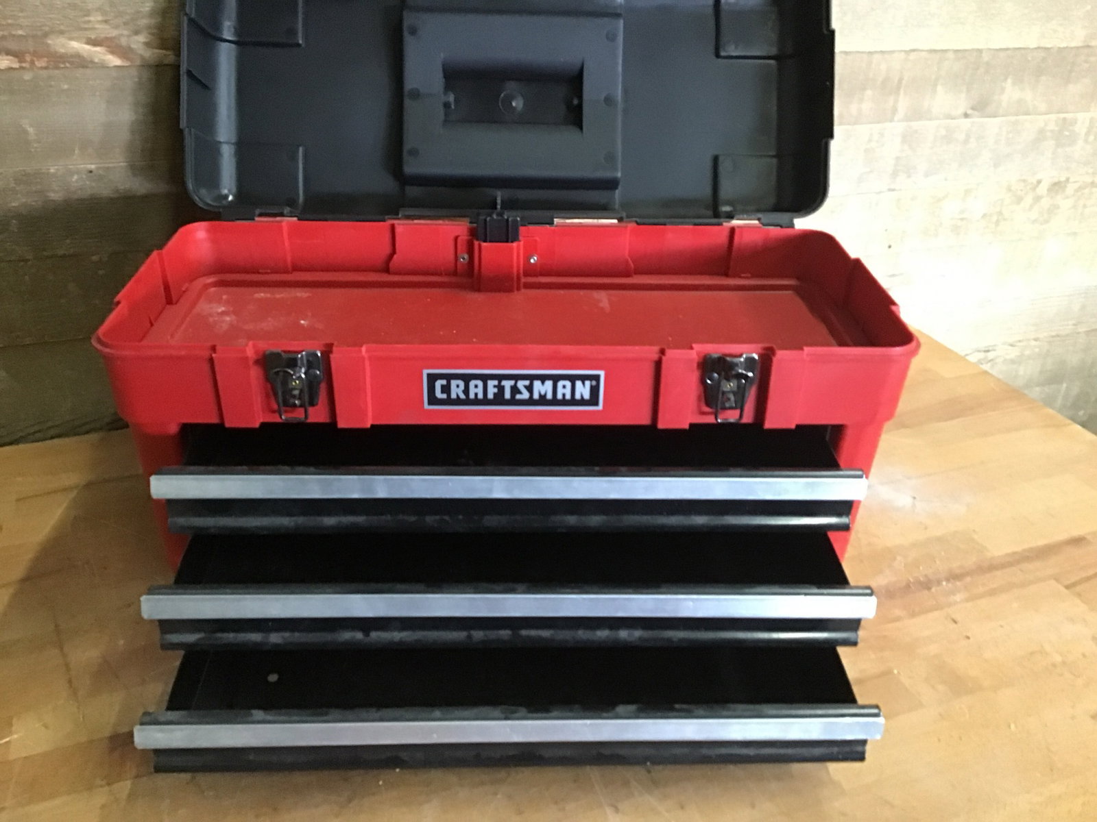Craftsman tool box with a top shelf and 3 sliding drawers that lock when top closes.