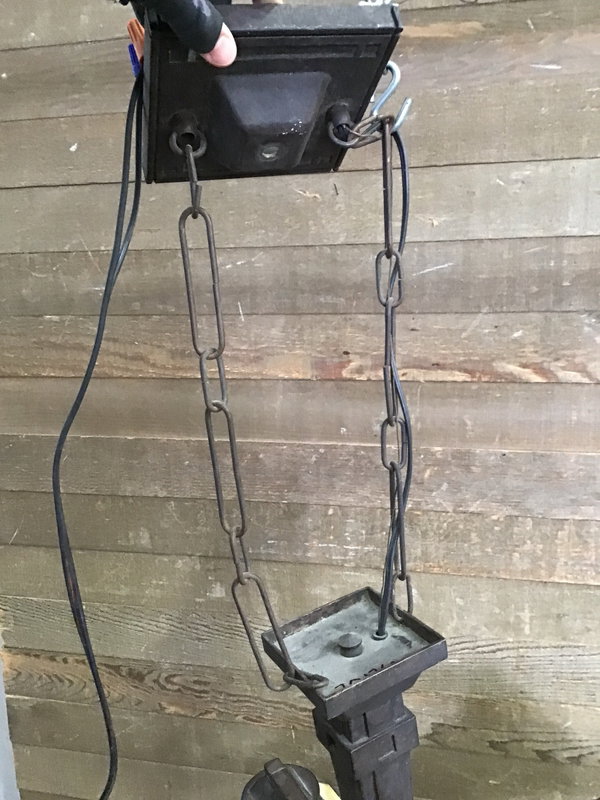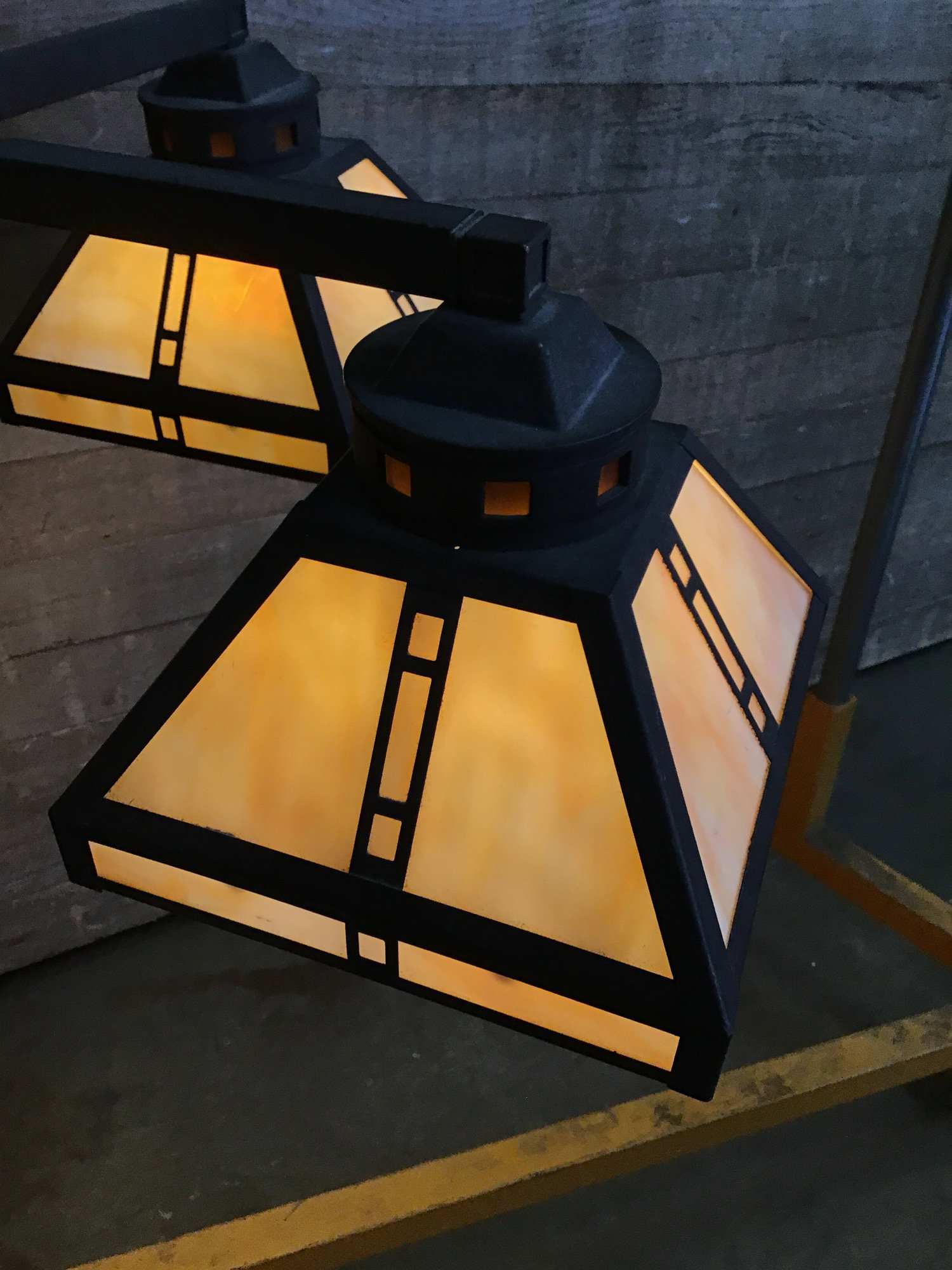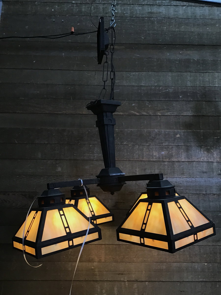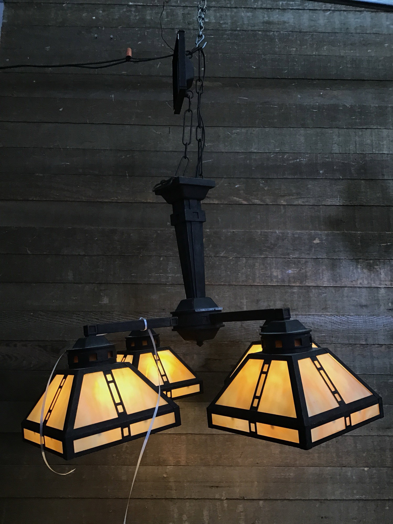 Previously installed, 4-light craftsman style chandelier. All of its beautiful slag glass panes are in wonderful condition. Chains are roughly 17" long. Look at her shine!