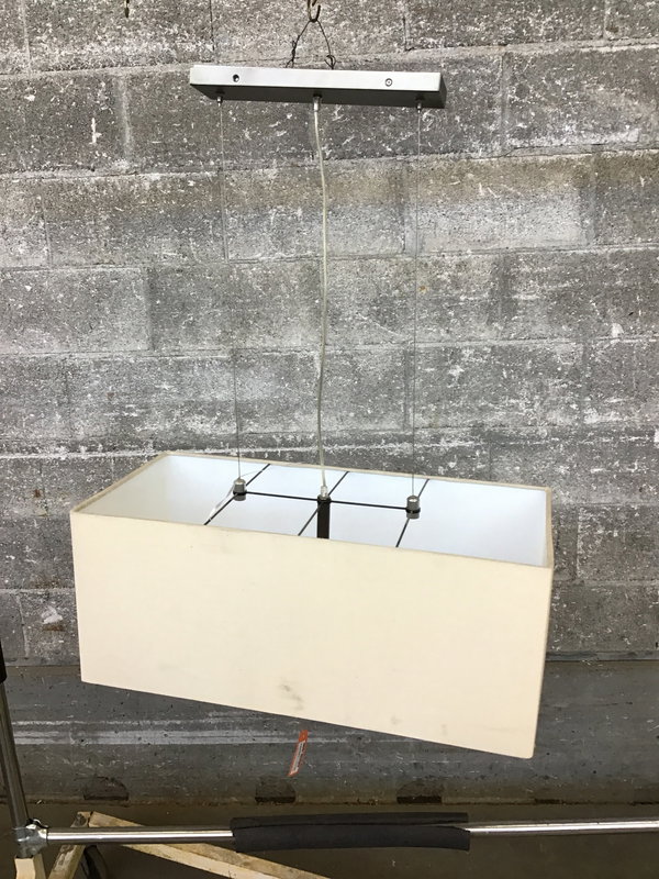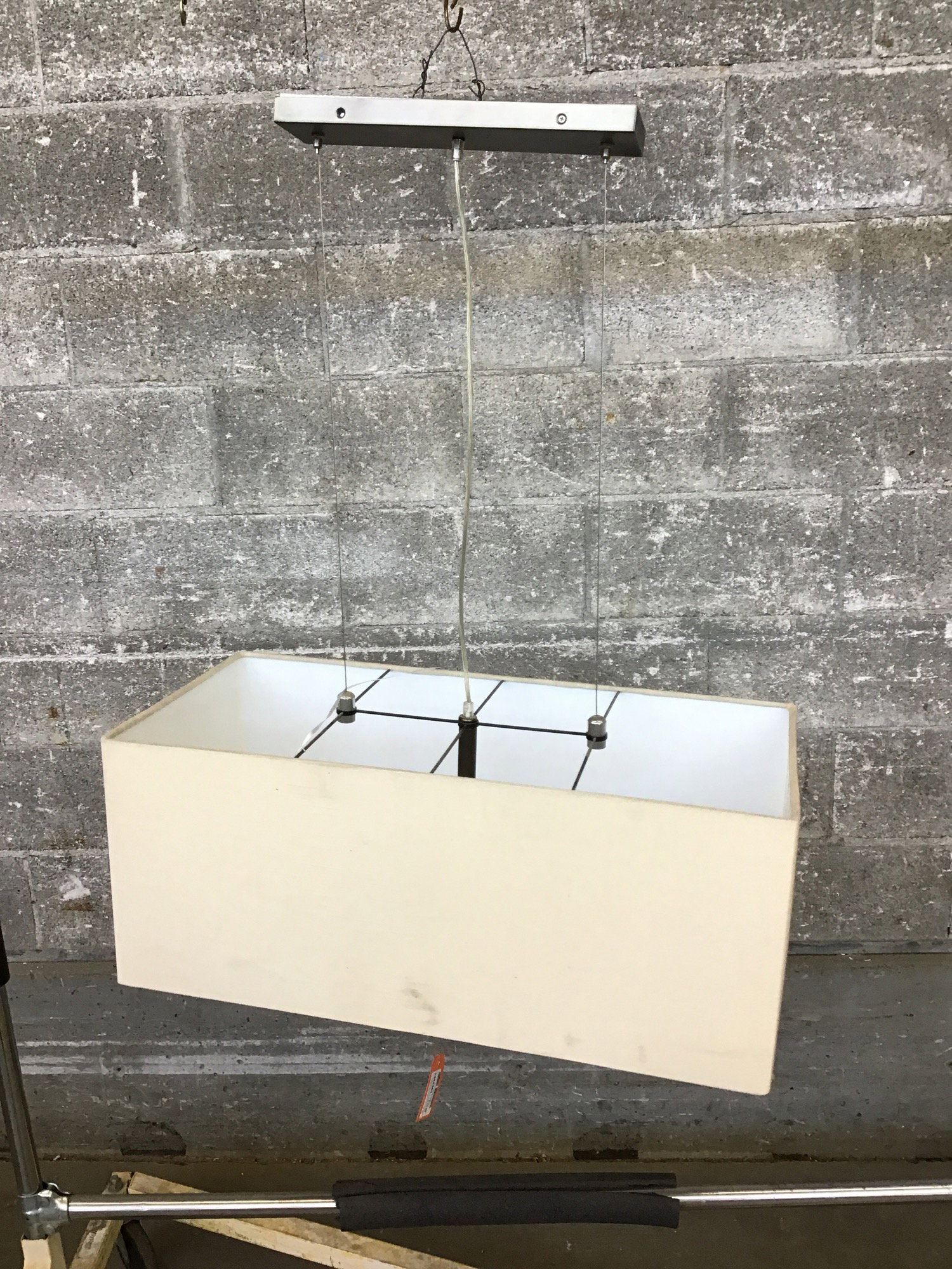 Linear chandelier featuring two bulbs and a rectangular linen shade by Crate & Barrel. Suitable for dry locations only.