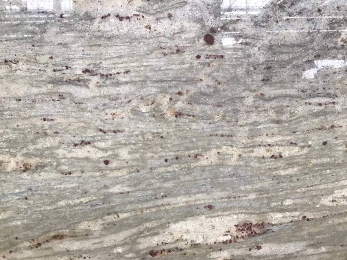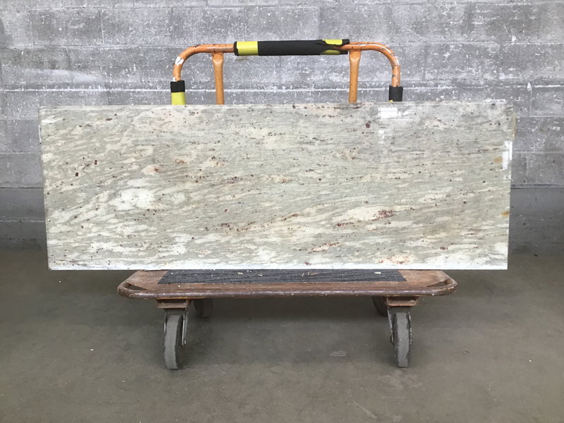 A slab of stone countertop that looks almost like cookies and cream ice cream with bits of red velvet mixed in. This slab also has two finished bullnosed edges, and aside from a bit of old adhesive, is ready to be plugged into your kitchen!