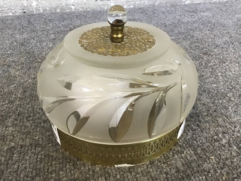 This is a petite but packed with style ceiling light! Has a brass fitter and frosted glass shade with floral design and some finer brass detailing. The cherry on top is glass ball finial!