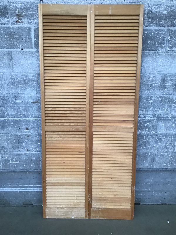 A louvered Bi-Fold door sporting fir construction with beautiful Clear Vertical Grain in the rails. It appears to be unfinished, ready for your stain of choice.