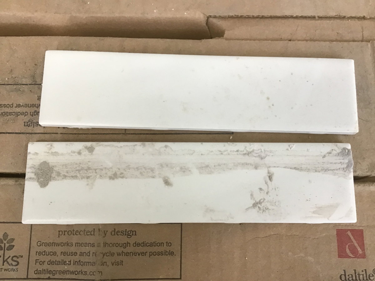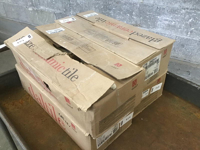 3.5ish boxes of rectangular 2x8in tile in "biscuit matte" from Daltile. A full box covers just over 10sqft, so I'd estimate this to get you around 35sqft.