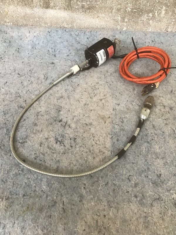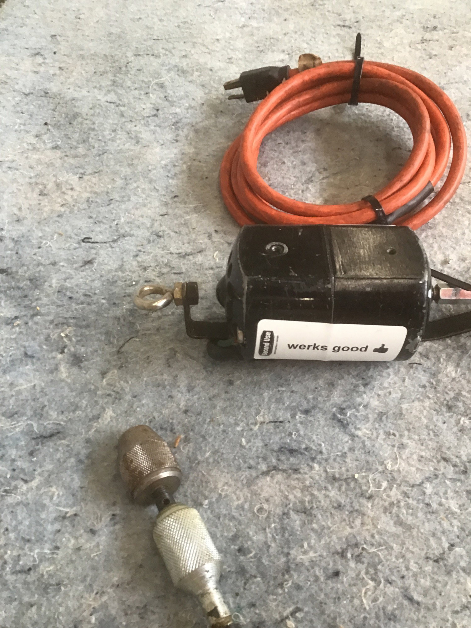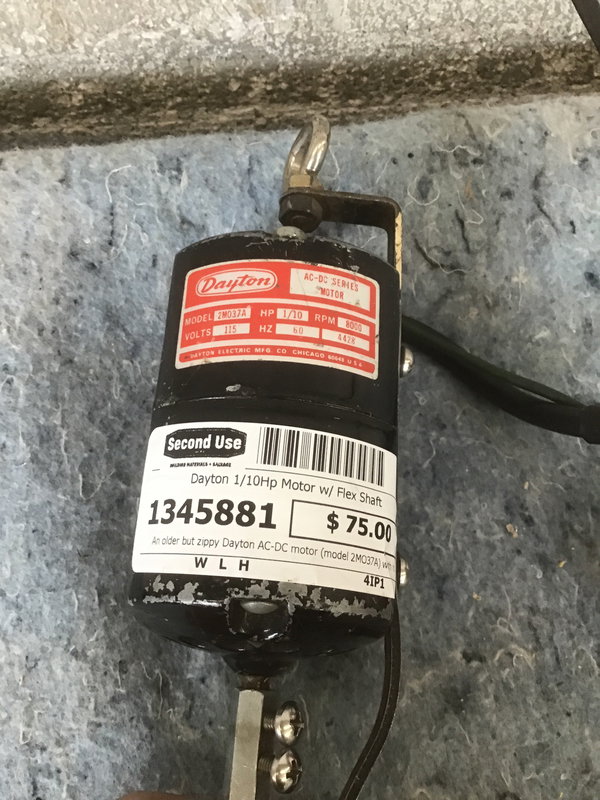 An older but zippy Dayton AC-DC motor (model 2MO37A) with rotary flex shaft attachment. The working end needs a new chuck key, but otherwise this lil guy works great! There is no on/off switch, so you'll want to be sure to plug it into a surge protector or outlet with switch control. The newest comparable motor from Dayton will run you about $140 without the flex shaft or rotary accessories.