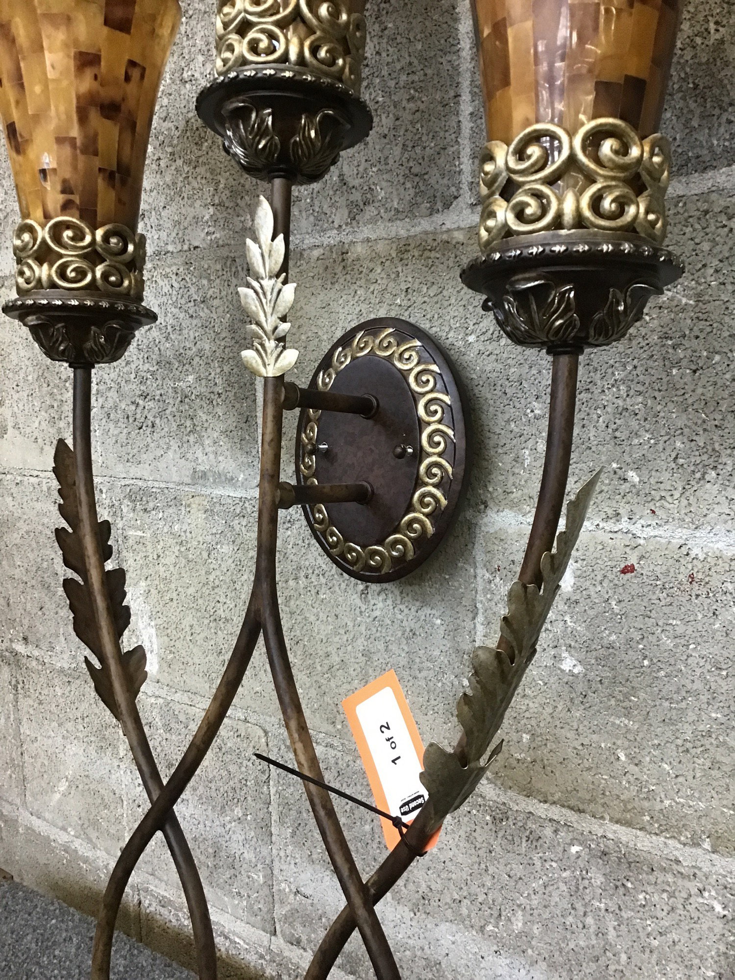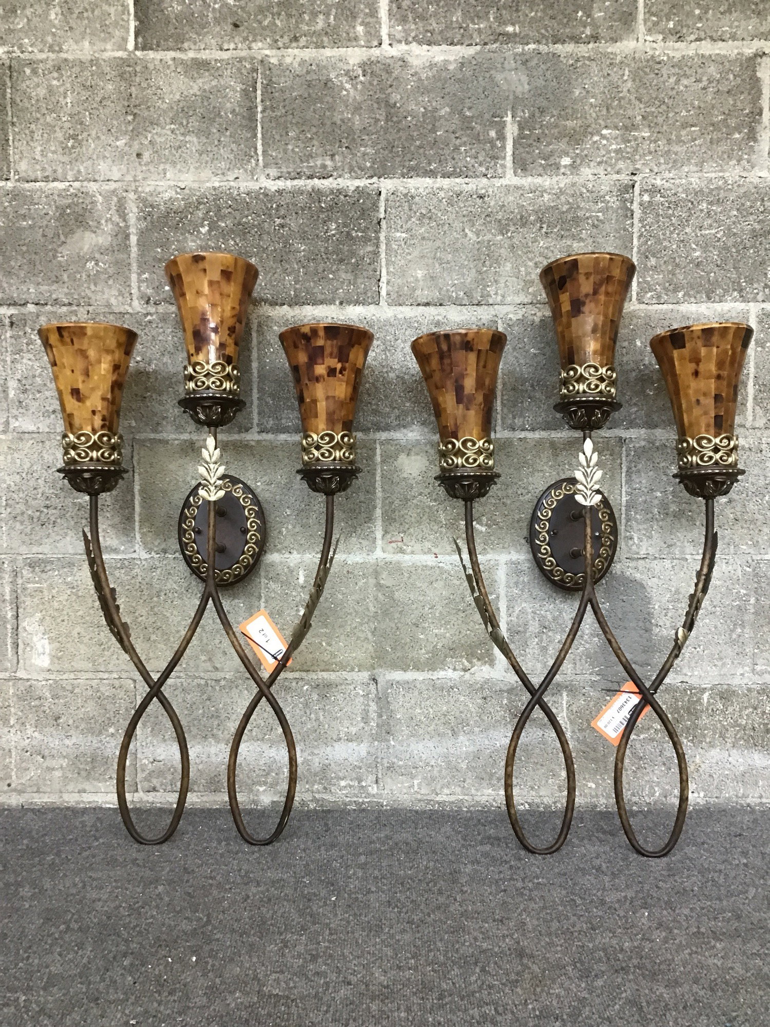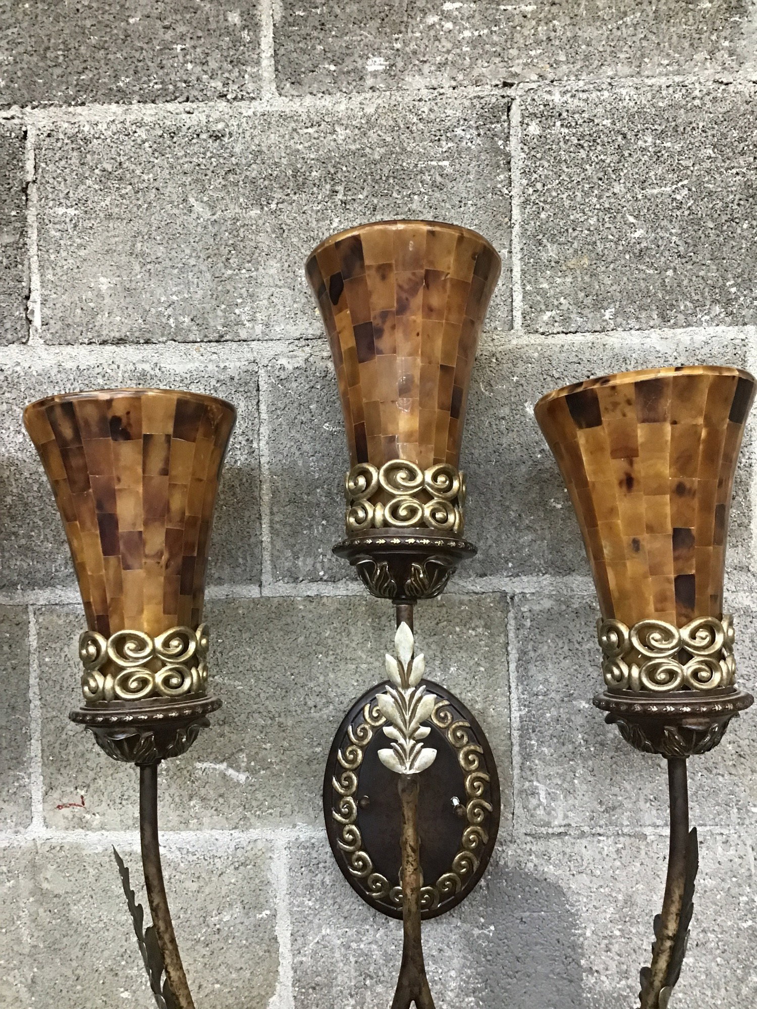 Pair of totally decadent 3-arm sconces with shimmering acanthus leaf accents and fiberglass shades that have a tiled appearance. Suitable for dry locations only.