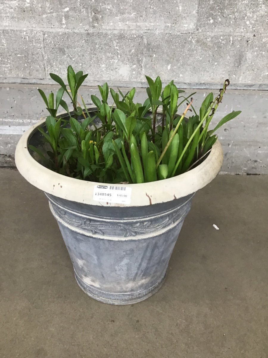 A good sized planter with some leafy shwoops and reeded borders. There are some plants inside that look like they were planted on purpose, but idk. Nurture them and see what happens, or ditch 'em and start fresh!