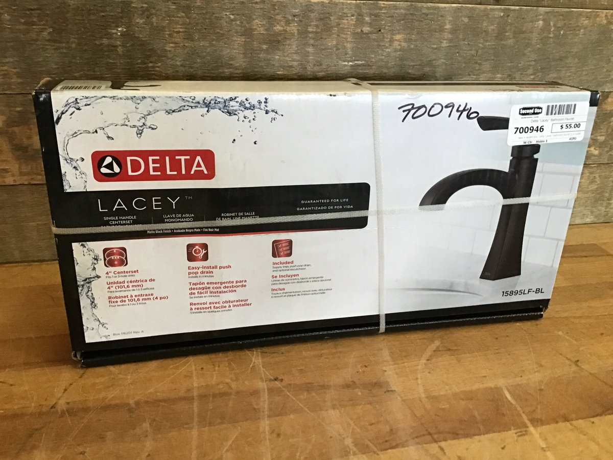 New in sealed box, Delta "Lacey" bathroom faucet in a matte black finish. Sells new at box stores for about $130, see here for details.
