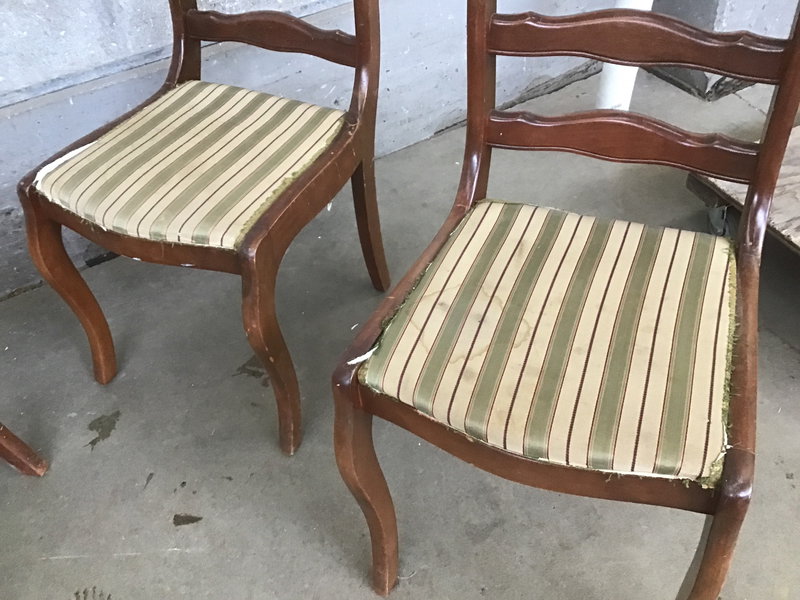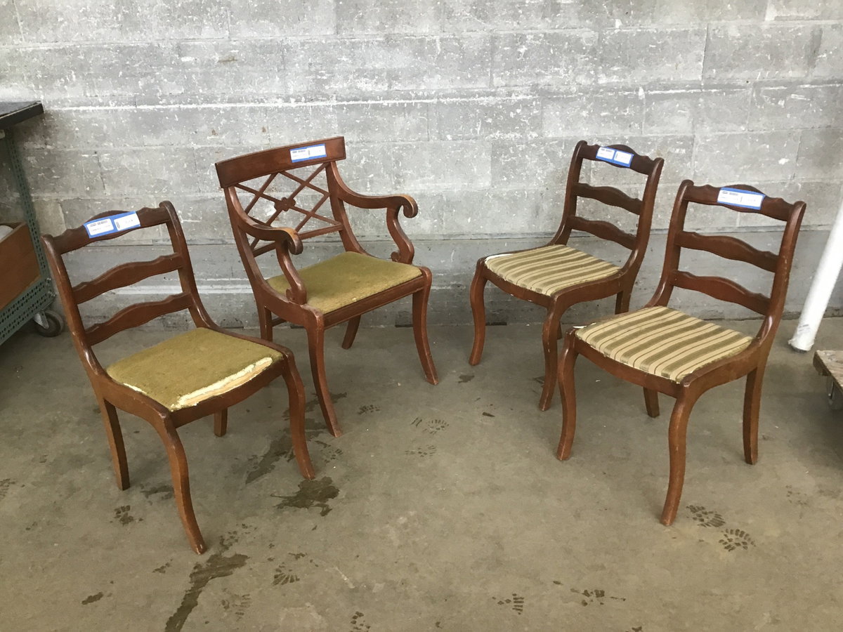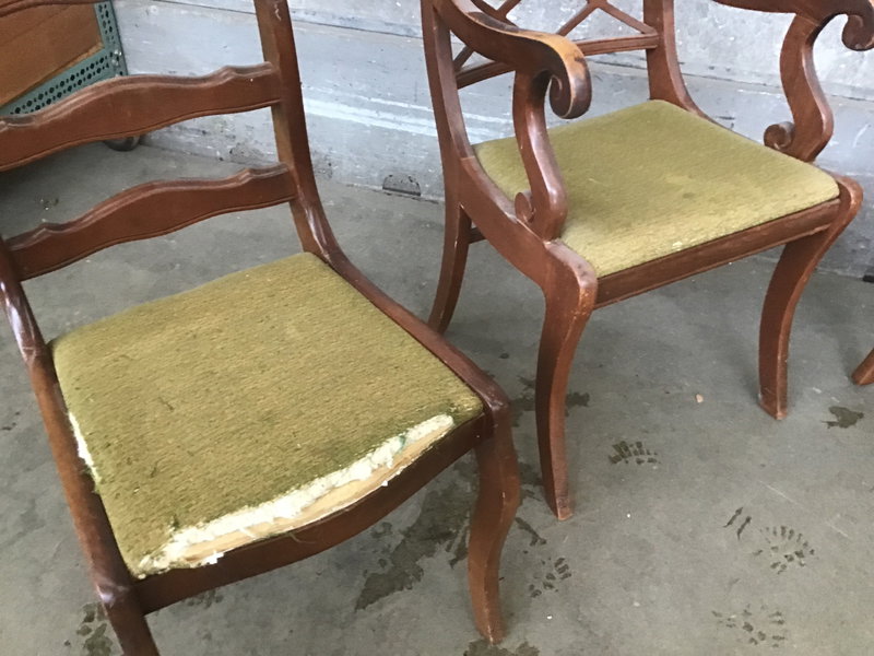 4 hardwood dining chairs, including one with arms. The seat cushion upholstery is not in great condition, but some new fabric would make these shine.