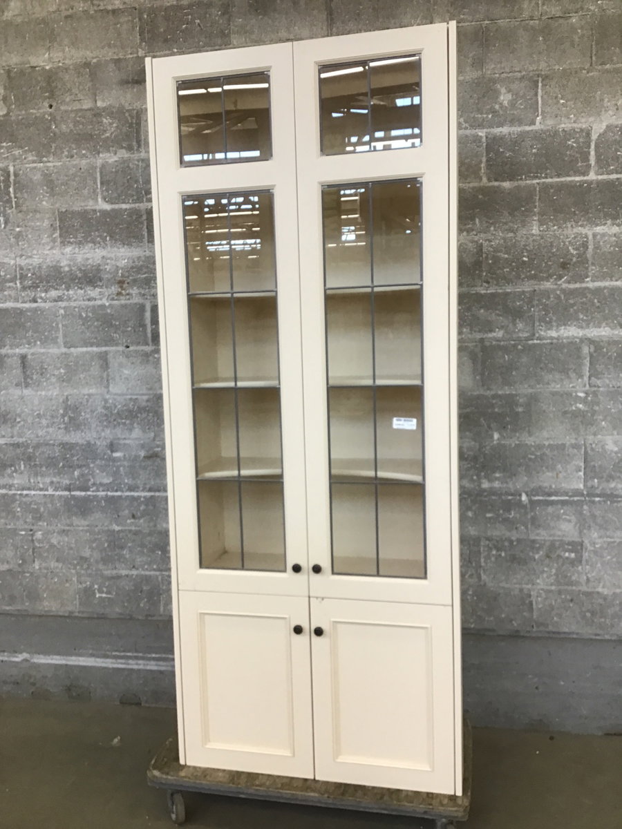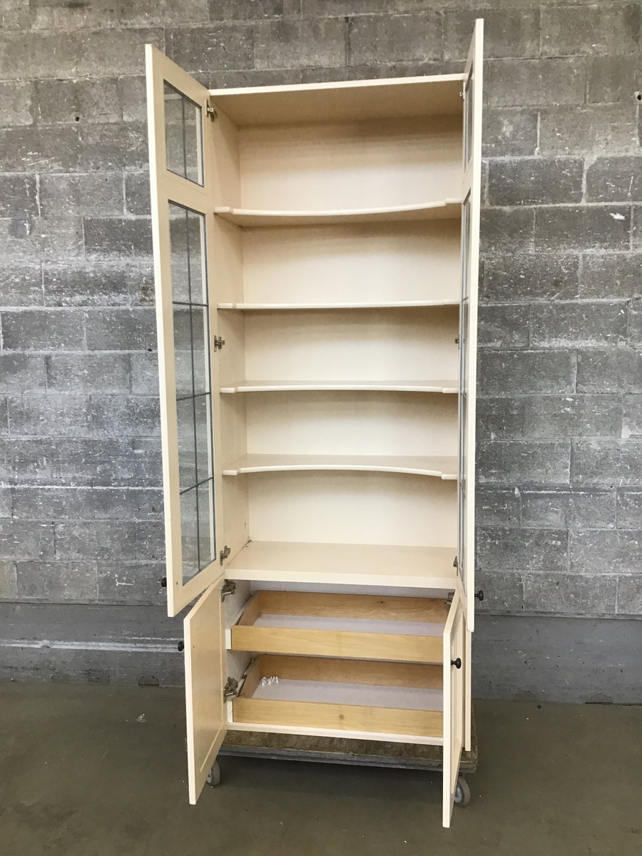 Tall cabinet with leaded glass doors on top, solid doors below with two pullout drawers inside. It's big, that's why we've priced it to move.