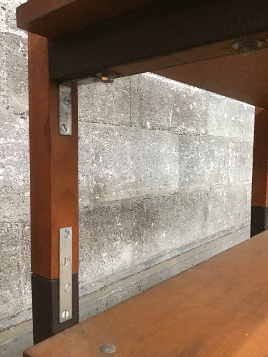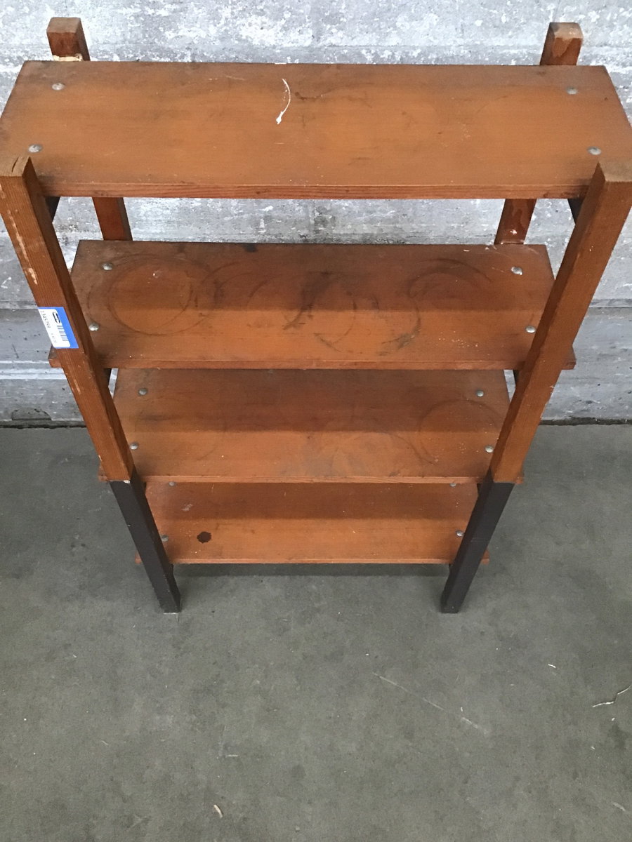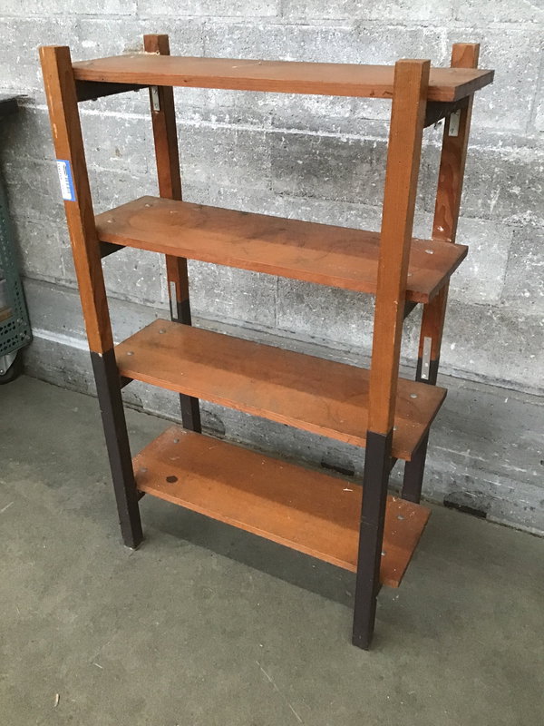 Homemade bookshelf with clear, vertical grain fir shelves and legs. There are four mending straps that hold the all stained unit atop the two shelves with painted legs. Could easily be disassembled into two, two shelf pieces.