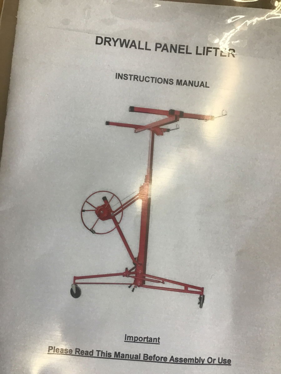 Drywall panel lifter that's still disassembled in its original packaging. It included a manual but there aren't any weight capacity listings anywhere so please use at your own risk.
