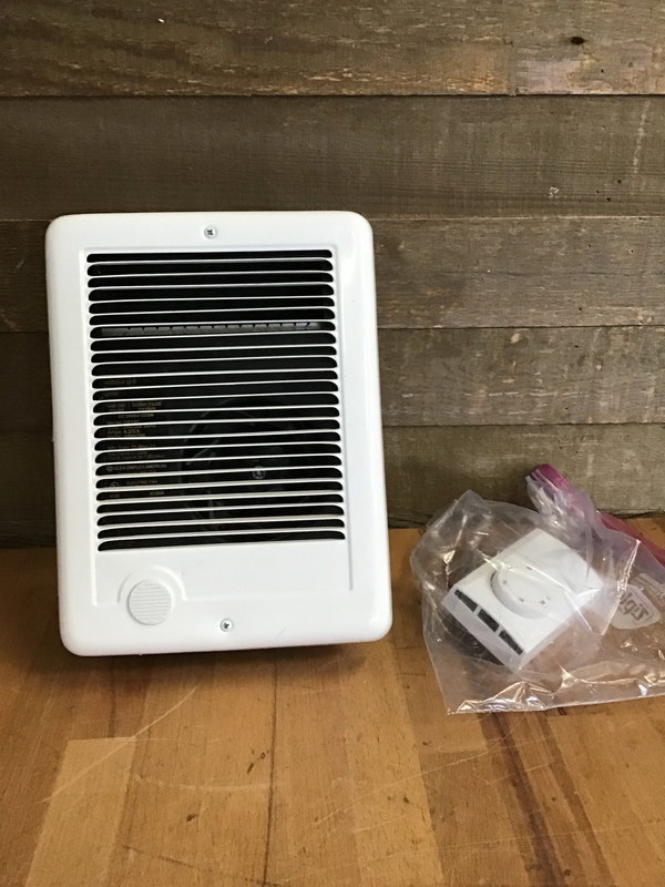 In-wall heater with fan. 1000W power. No onboard thermostat, but a separate thermostat is included.