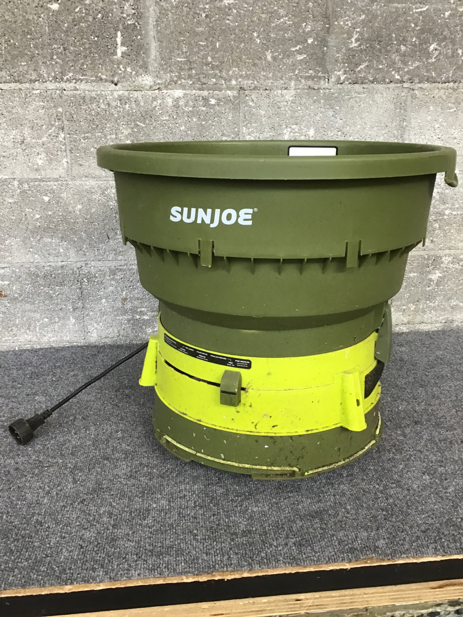SunJoe Electric 13 Amp Leaf Mulcher. Comes with 3 adjustable legs and bungies on the side to attach a mulch bag to collect your tinier bits of leaves. Watch your fingers!