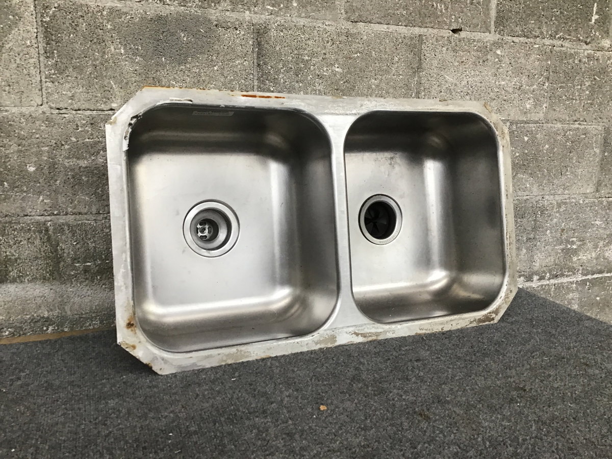 A thicker an average stainless steel kitchen sink with two basins that looks to be in good shape.