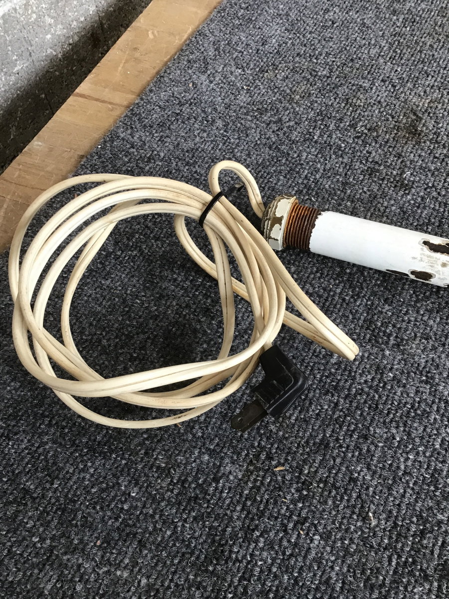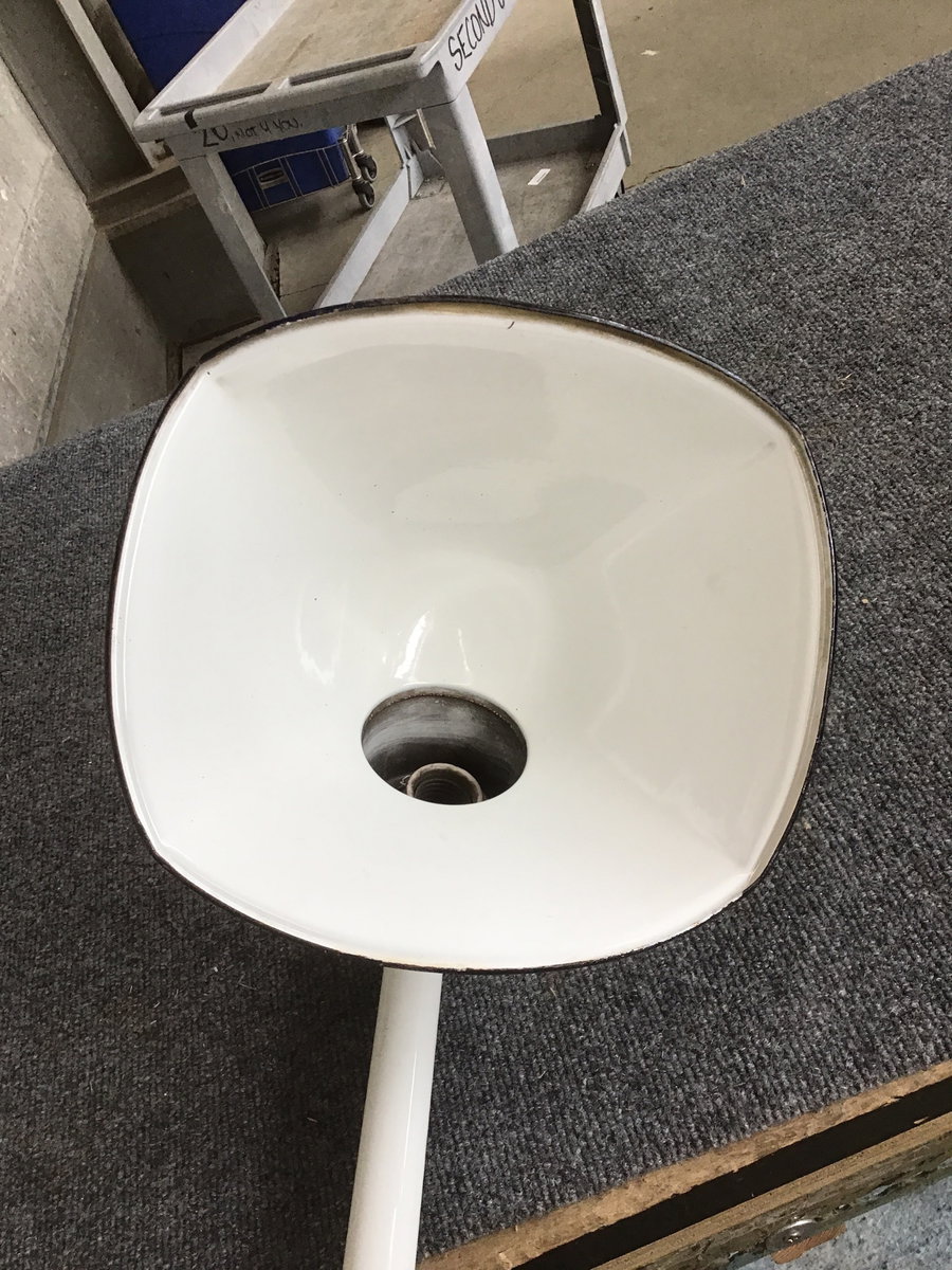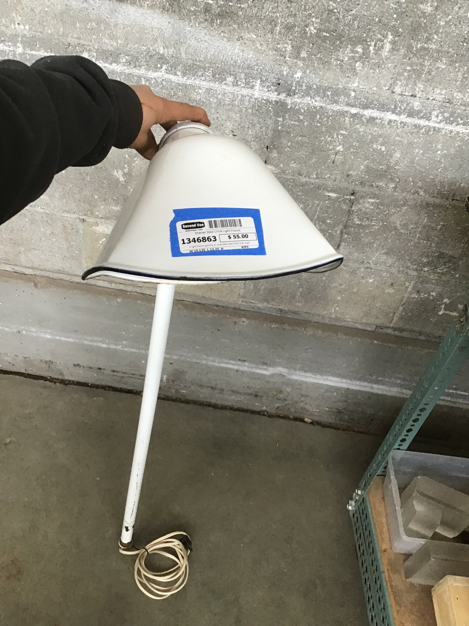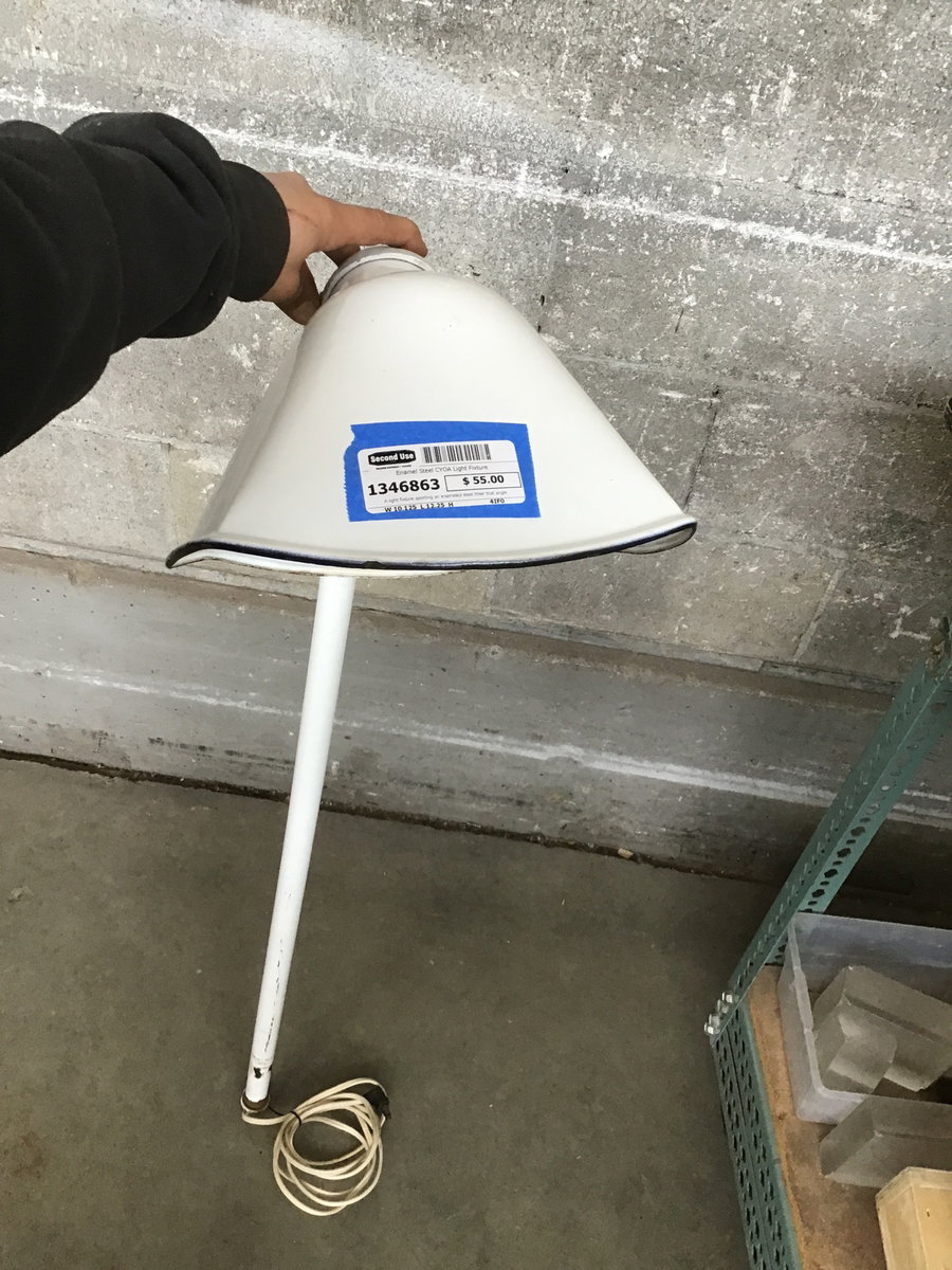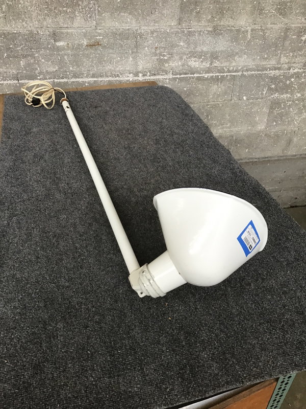 A light fixture sporting an enameled steel fitter that angles the light downward connected to a run of enameled conduit. It looks to me like it may one have been a wall light for a hall, but you can do whatever you like with it! It's wired to a plug, so no hard-wiring necessary!