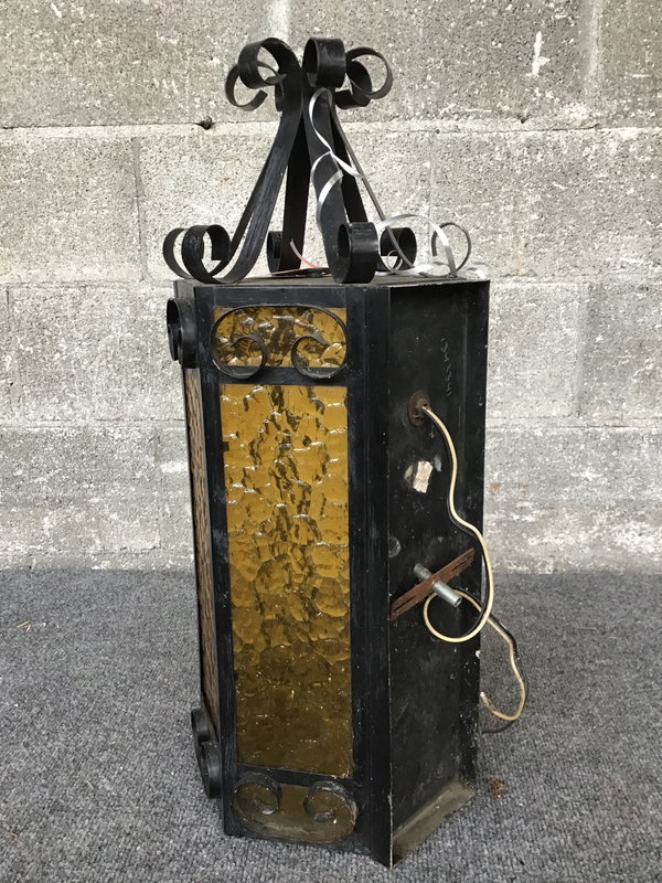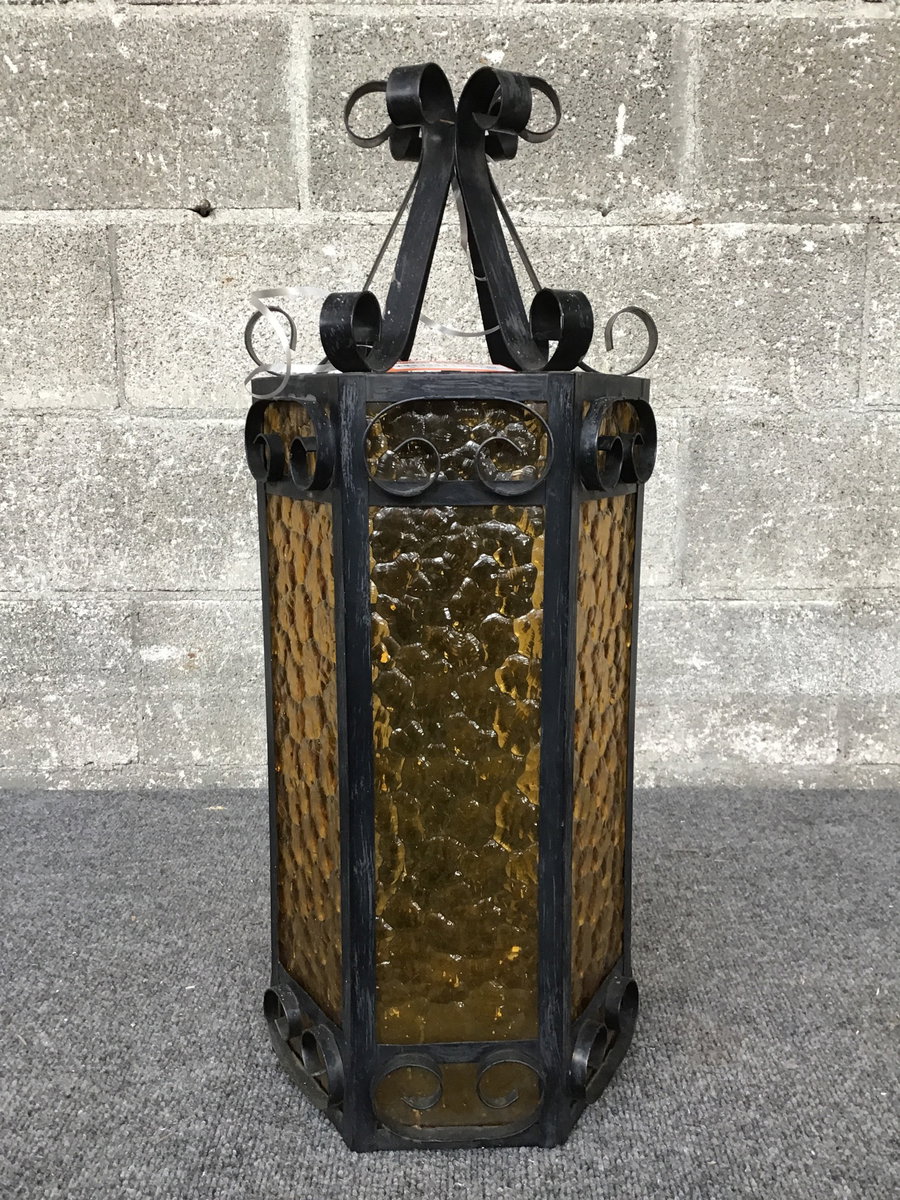An exterior wall sconce with a matte black finish to its Spanish Gothic Revival construction with five panes of Amber glass obscured in the Minster style surrounding one bulb.