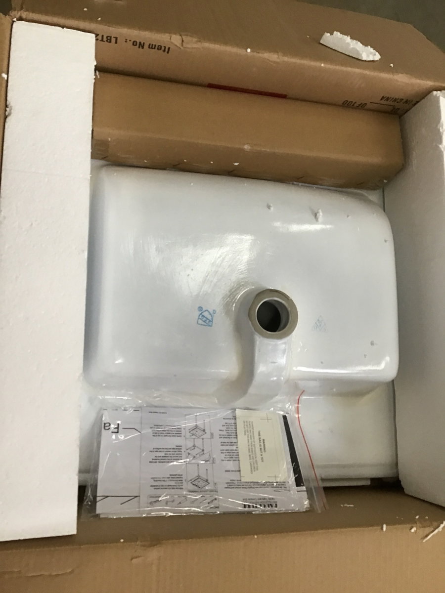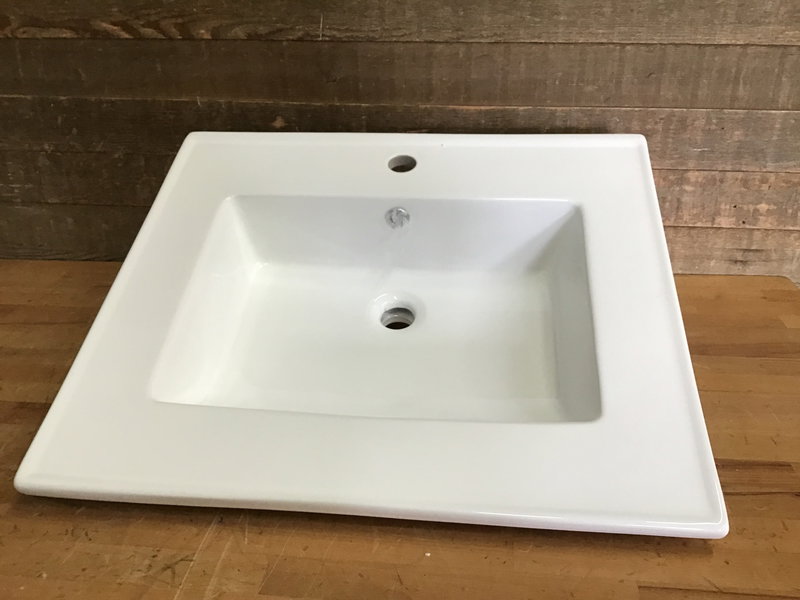 Fauceture porcelain vanity top with integrated sink by Kingston Brass. This came to us new in box and includes hardware. Has one 1.5" faucet hole. Sells new online for over $200, see here for details. Would pair well with the Kingston Brass Console Sink Legs in stock #700486.