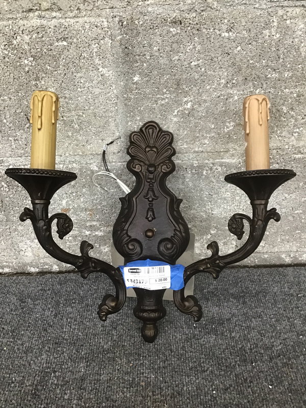 An ornate double candlestick sconce circa 2008 with acanthus-y flourishes and oil rubbed bronze finish.