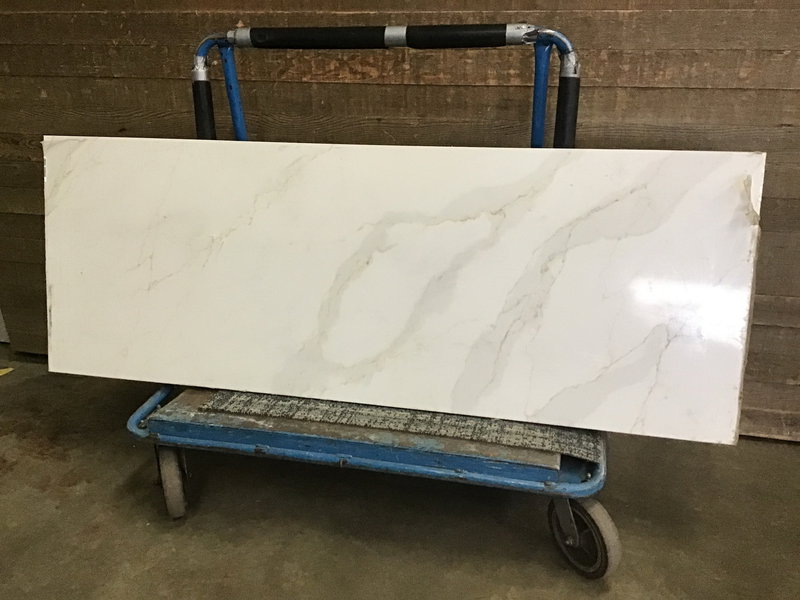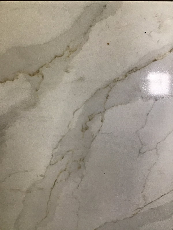 Beautiful faux marble countertop with a white base and gold and gray marbling throughout. This piece has three straight edges and one fully finished edge. Still has the protective wrap on the surface. There is approximately 12.95 square footage of surface space.