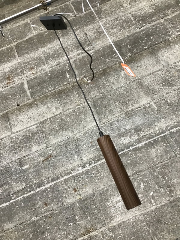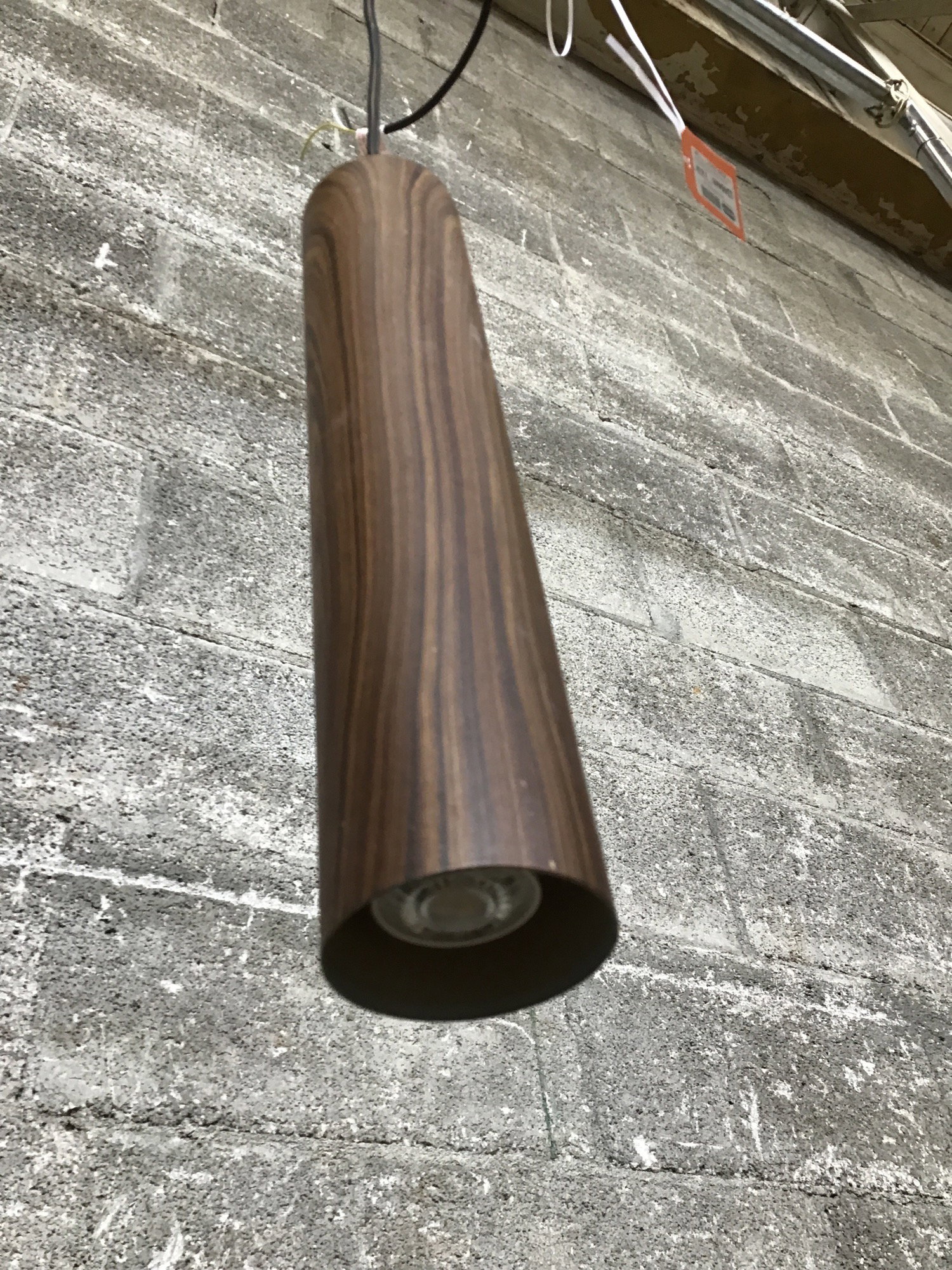 Faux wood cylindrical pendant light fixture with single light and black matte cord and mounting hardware. For dry locations. Diameter of pendant is 2.378". height of pendant is 12", and length of cord is ~54" and can be easily adjusted to your needed height.