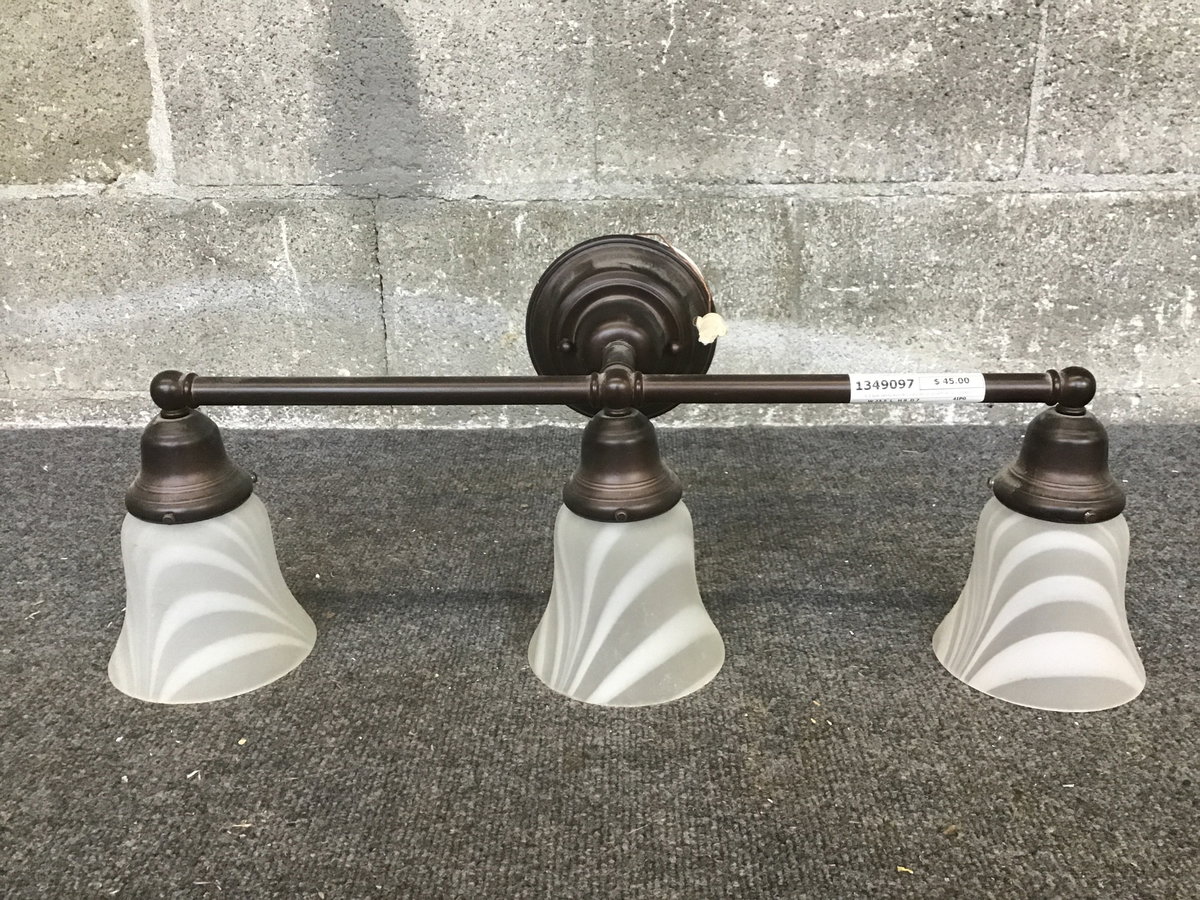 A 3 bulb vanity sconce circa 2000 or so with an oil rubbed bronze finish and 3 unique blown glass shades that have a stripey-feathery pattern.