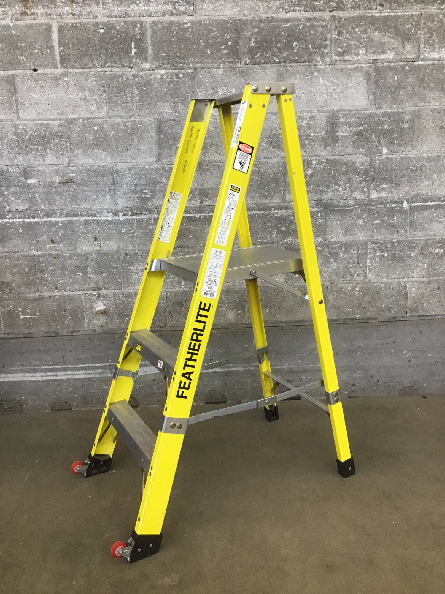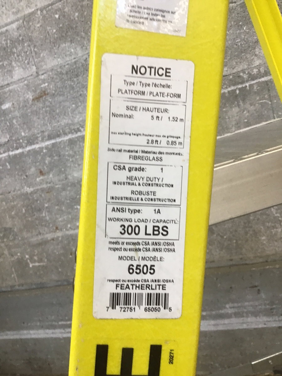 From Featherlite, this extra heavy duty 5' step ladder features fiberglass construction with three aluminum steps, a top step that doubles as a tool / paint platform, two wheels, and a 300 lb capacity. These ladders retail for upwards of $400 and this one appears to be lightly used and in excellent condition.