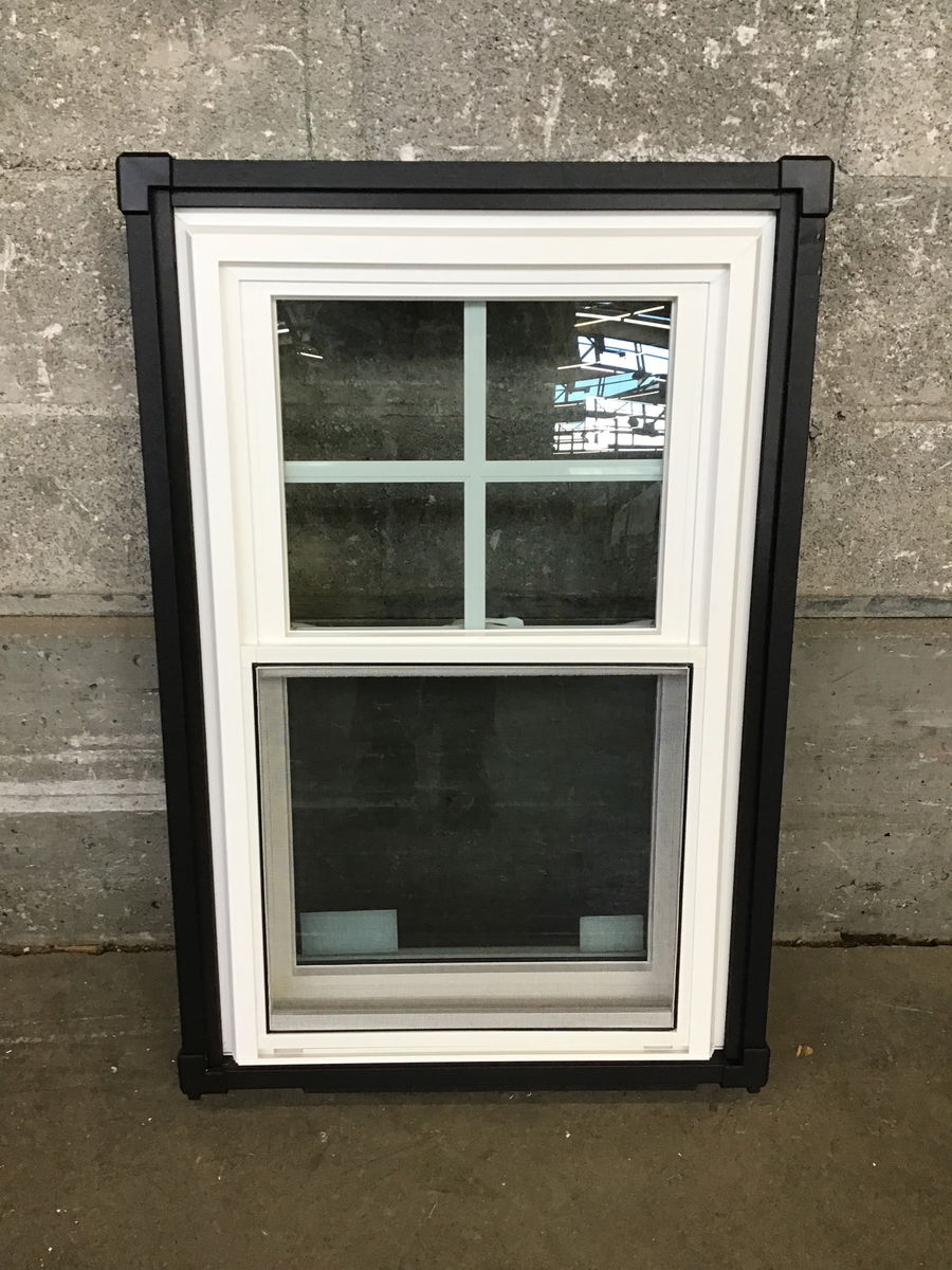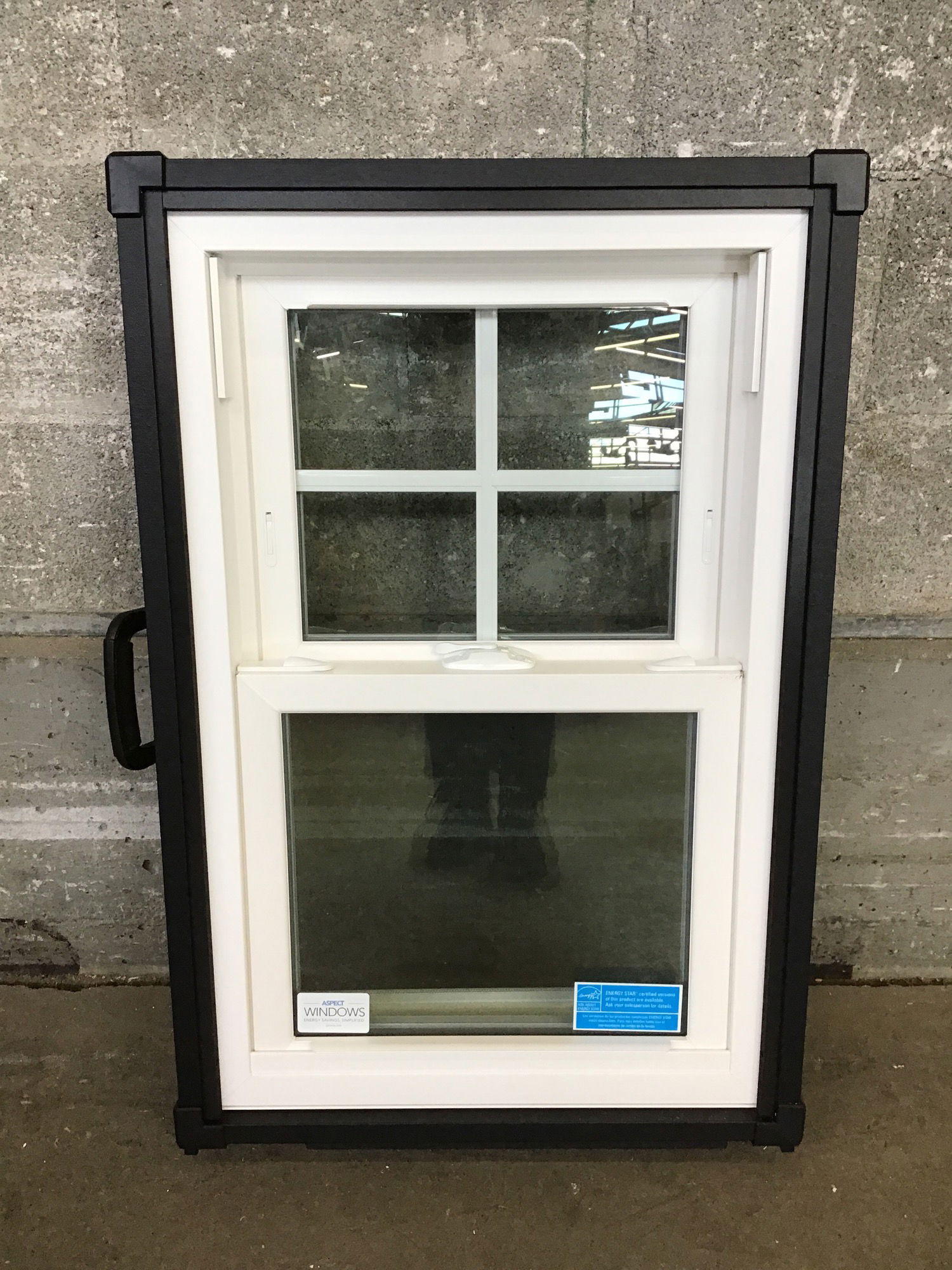 New sample single hung window currently encased in a frame with a handle making it easy to move, it appears the case can be removed.