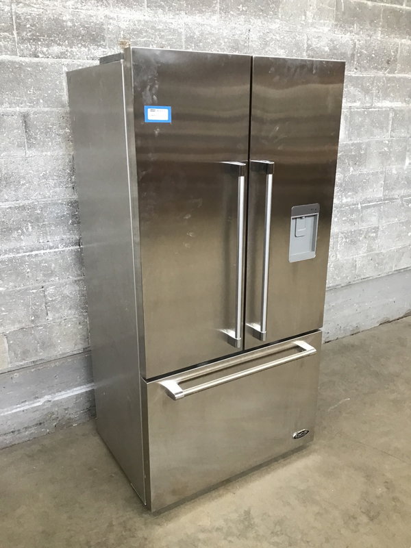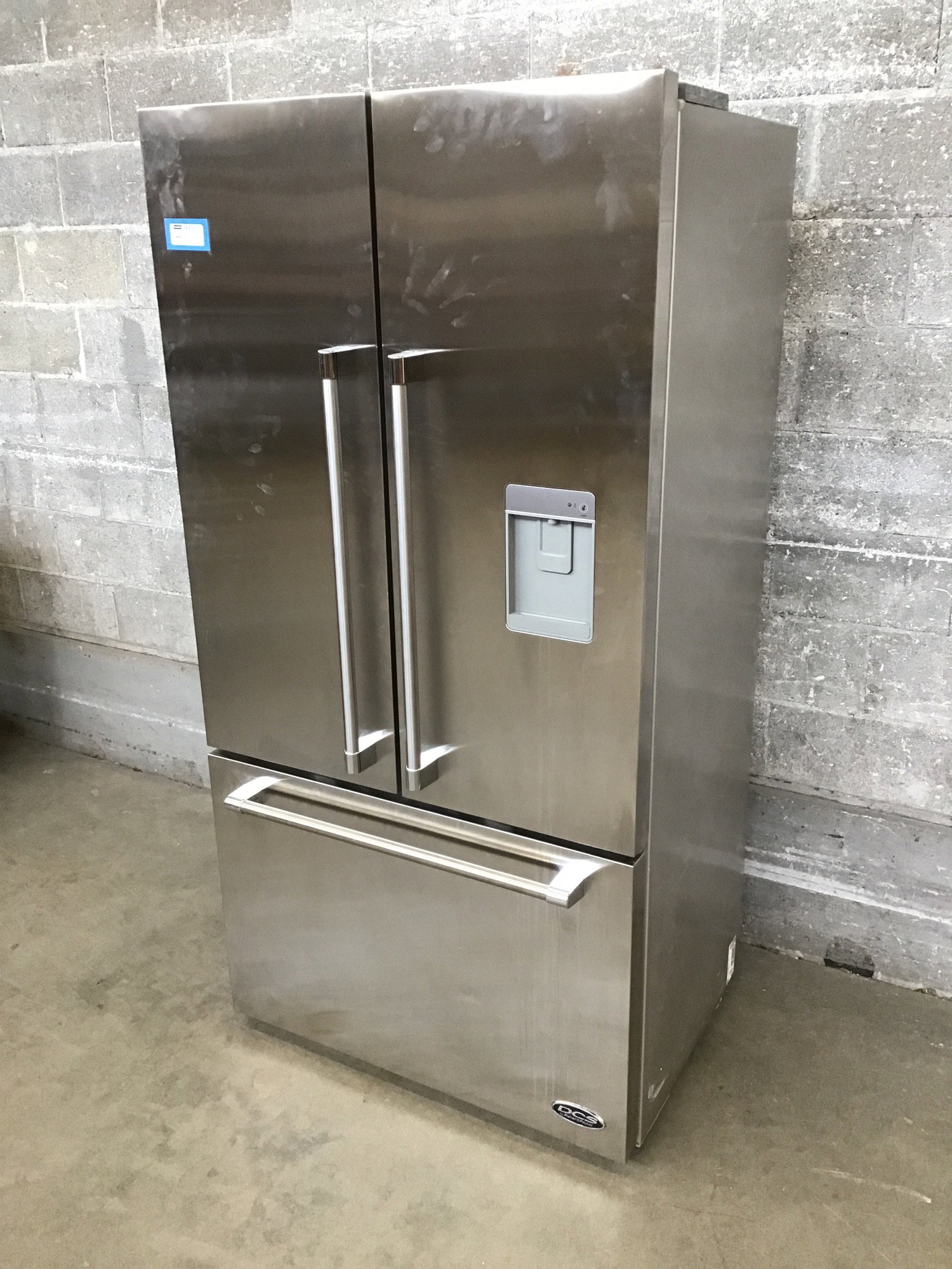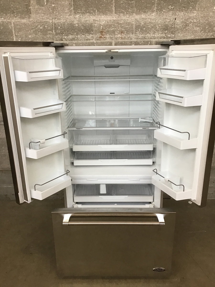 Stainless steel Fisher & Paykel DCS fridge in good shape. Likely a 2017, we're unable to verify, but this model is still available online. Door seals are a little tired, and the flange on one door is a little sticky, price reflects.