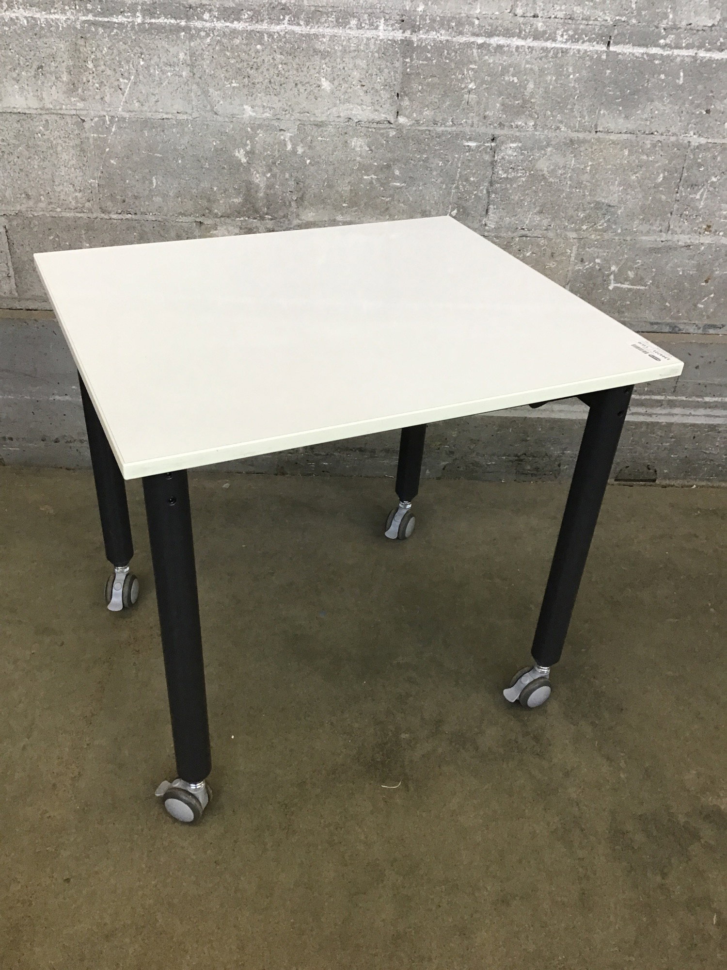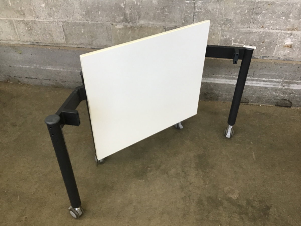 Unique folding work desk, previously from a school. This desk can tuck away easily when the two front legs are pushed to the side, allowing the laminate tabletop to fold down. This unit could easily be rolled into a closet when not in use. Photo is representational.