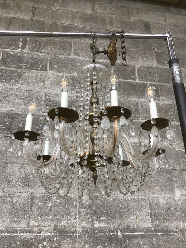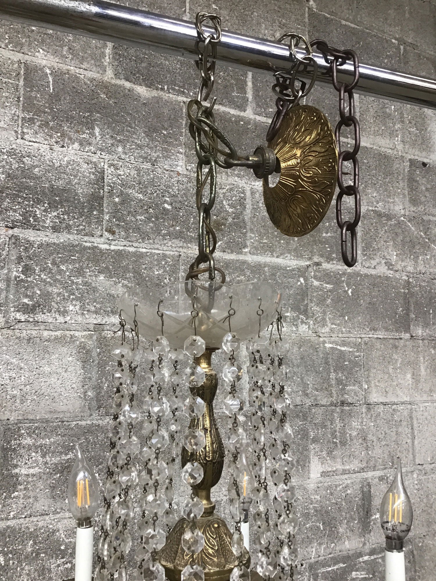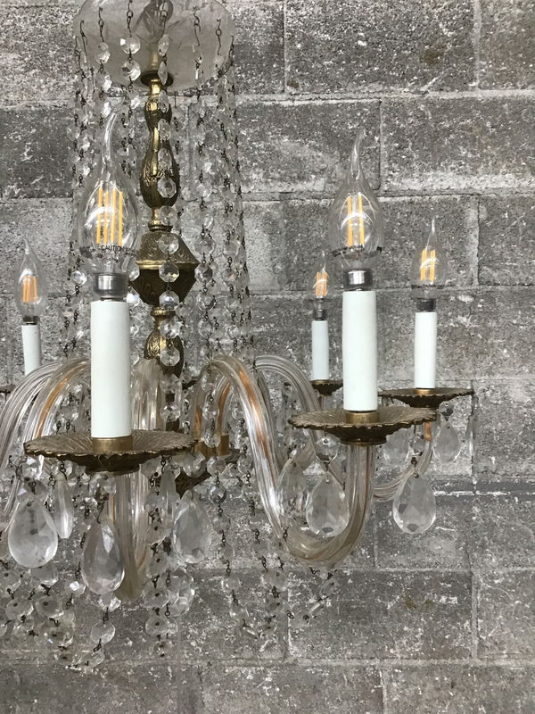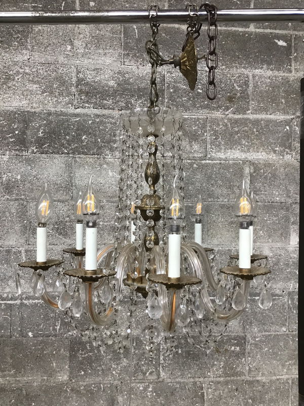 This vintage 8-arm chandelier is absolutely dripping in crystals. Crystal strands, crystal teardrops, a crystal bobeche, crystal arms. As a lover of fine crystals, what more could you ask for? The crystals are tastefully punctuated by an ornate brass stem, bobeches and canopy.