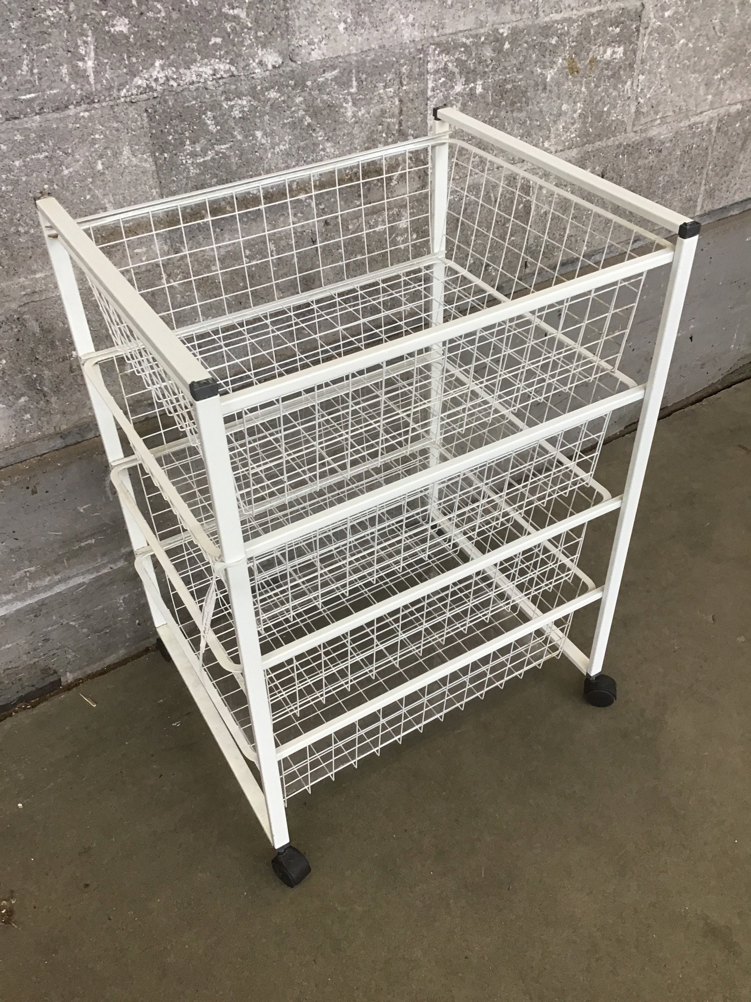 A rolling solid metal cart with a painted white frame. This cart has four tiers of storage, each tier can be pulled out for ease of access and rolls around for ease of usage.