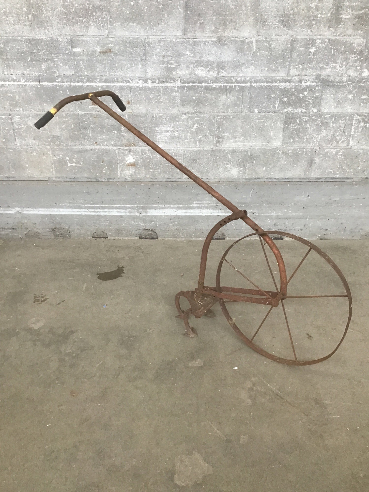 This front wheel, hand powered cultivator could probably still do the job, but it's got the perfect amount of rusty patina for yard decor.
