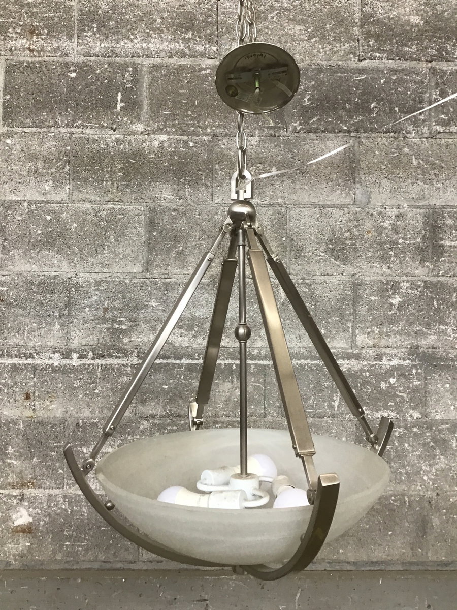 Hampton Bay brand chandelier with a frosted bowl shade and interesting jointed nickel hardware holding everything in place. Takes three bulbs.