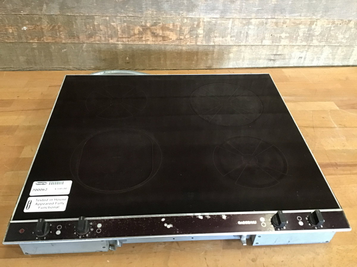 German made, Gaggenau electric cooktop in good, used condition. There are three standard burners and one halogen burner, all tested in house and got hot. There's a little wear on the service panel, but only cosmetic. Cannot confirm age without a serial number, but we believe it's from around late 90s, early 2000s based on looks. Great for a tiny house or van!