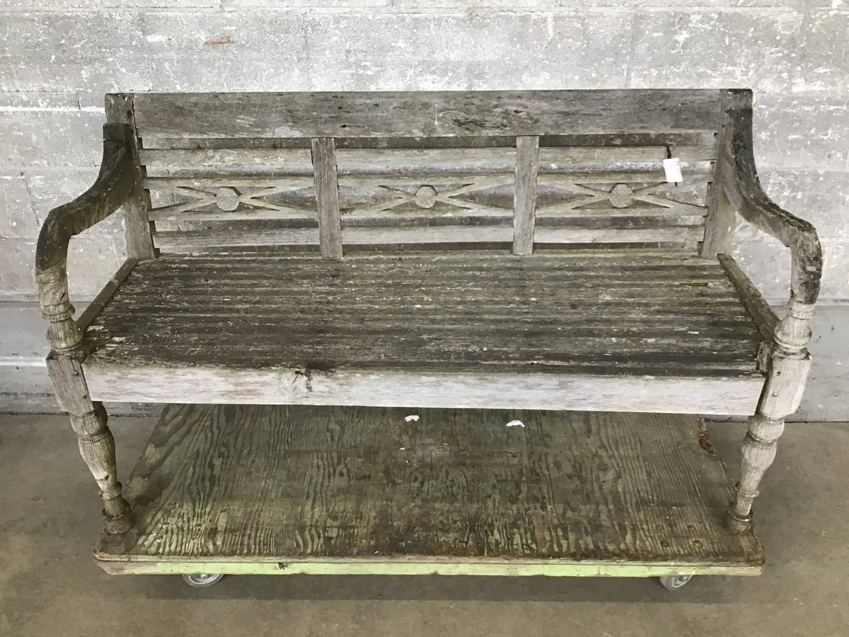 Wood garden bench that has spent a fair amount of time outside. Has a great weathered look, but it's a little rickety and would likely make a better plant stand than a bench unless you shore it up.