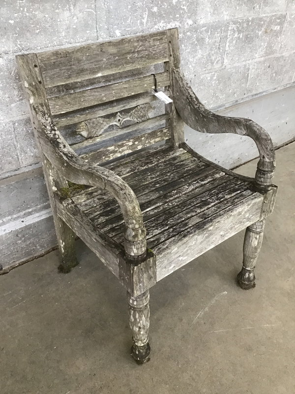 Wood garden chair that has spent a fair amount of time outside. Has a great weathered look and seems sturdy enough to sit on, but would probably be best served as a plant stand or garden decor.