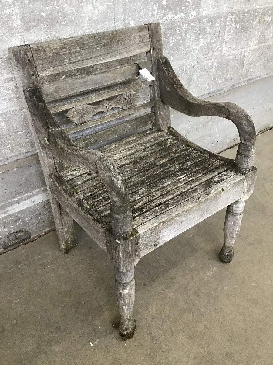 Wood garden chair that has spent a fair amount of time outside. Has a great weathered look and seems sturdy enough to sit on, but would probably be best served as a plant stand or garden decor.