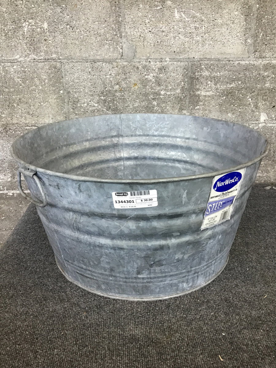 Galvanized steel washtub that has holes drilled in the bottom for drainage. Great place to put some plants!