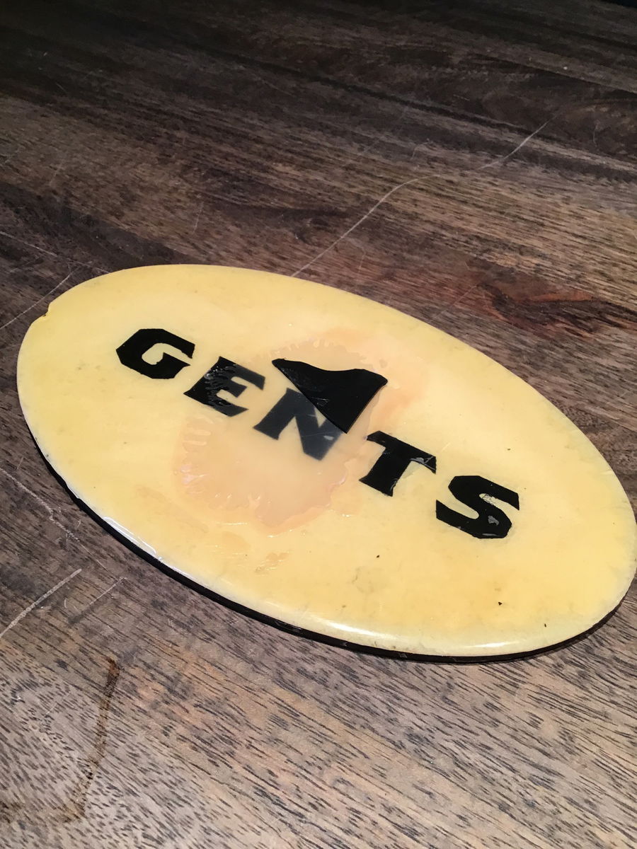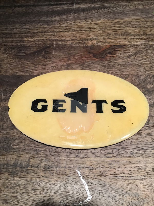 Fragile restroom sign for the Gents! Bathroom sign with epoxy covering it on one side. Has a little damage and a piece of plastic stuck to the front this is a very odd piece. Don't fall in!