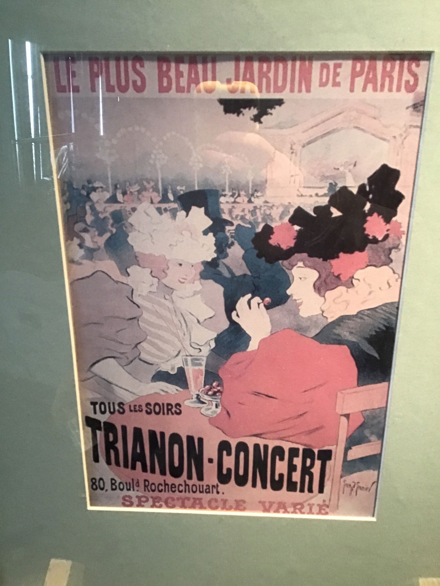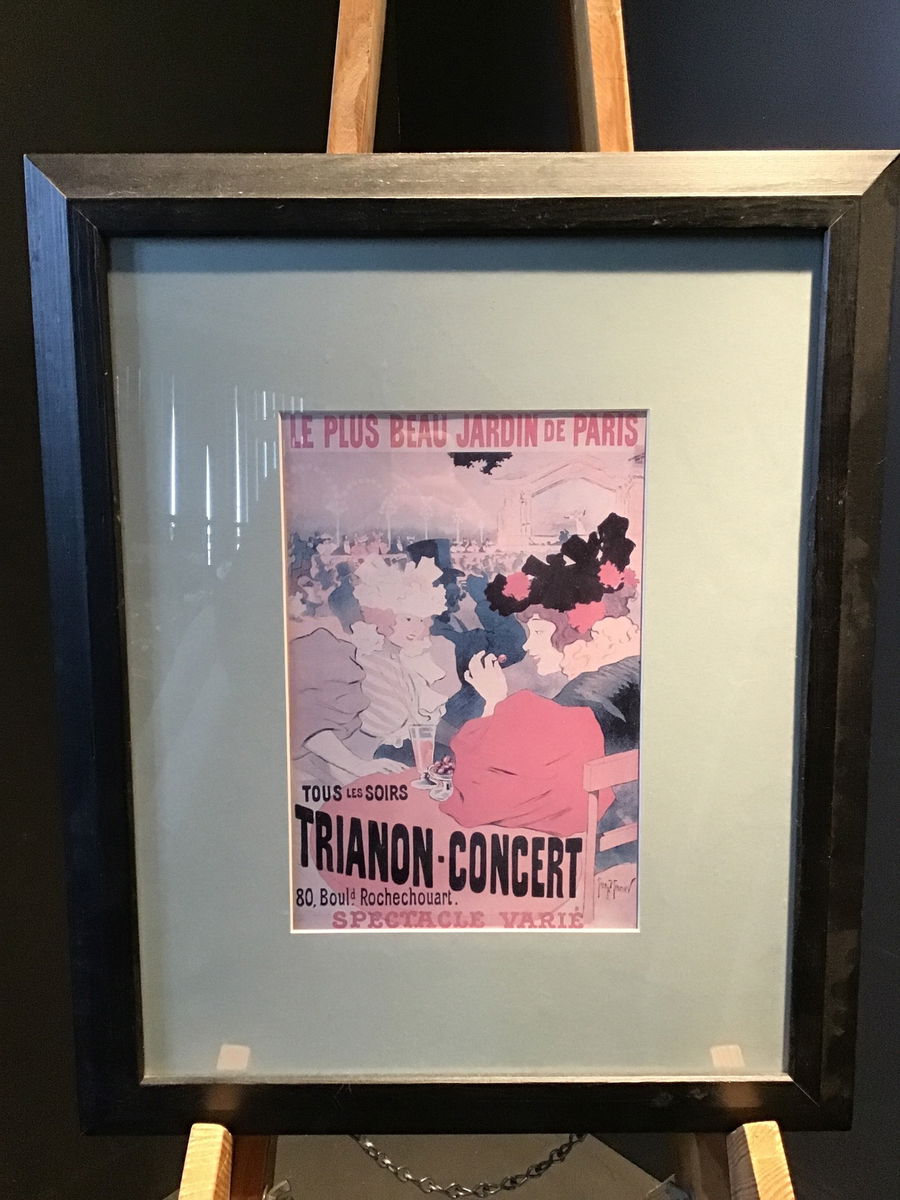 Faded print of an advertisement from the 1890s painted by Georges Meunier. The print shows an ad for a concert at the famed Le Trianon theater in Paris. In decent shape even if the print is a tad faded.