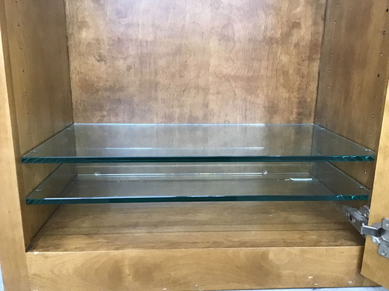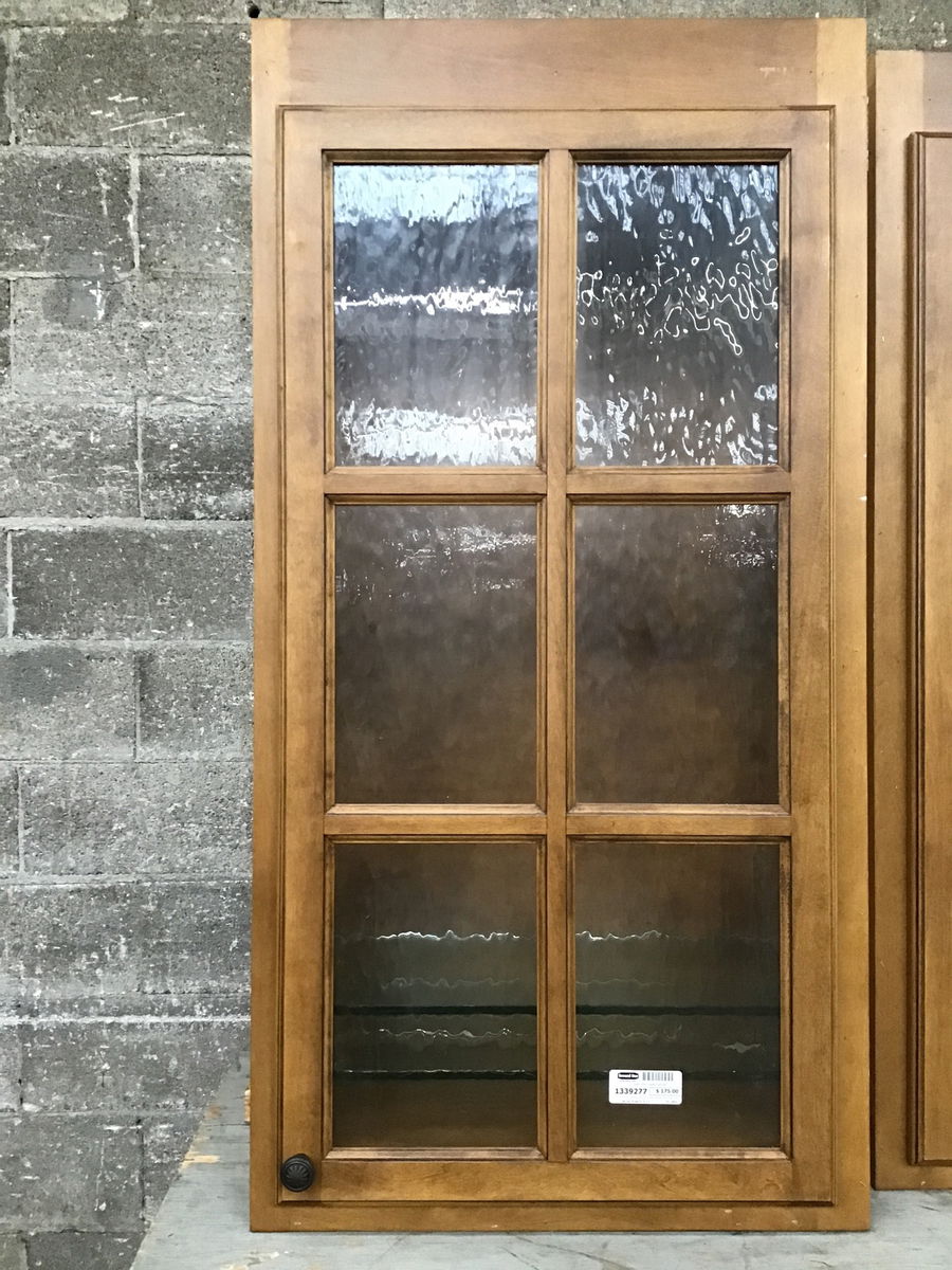 This is a plywood box, birch faced cabinet with 6-lite, true divided glass doors. The glass is textured and wavy. There are two glass shelves that are adjustable.
