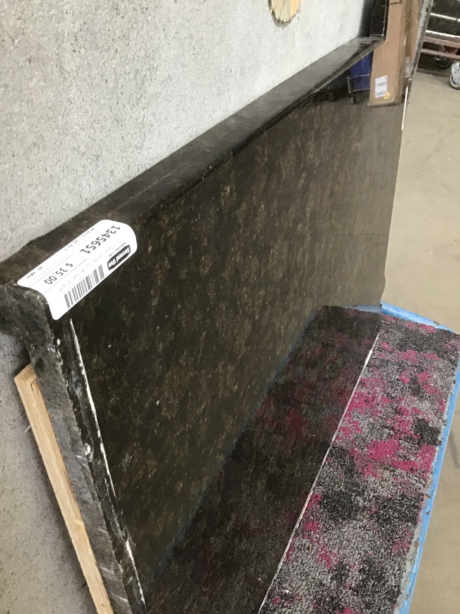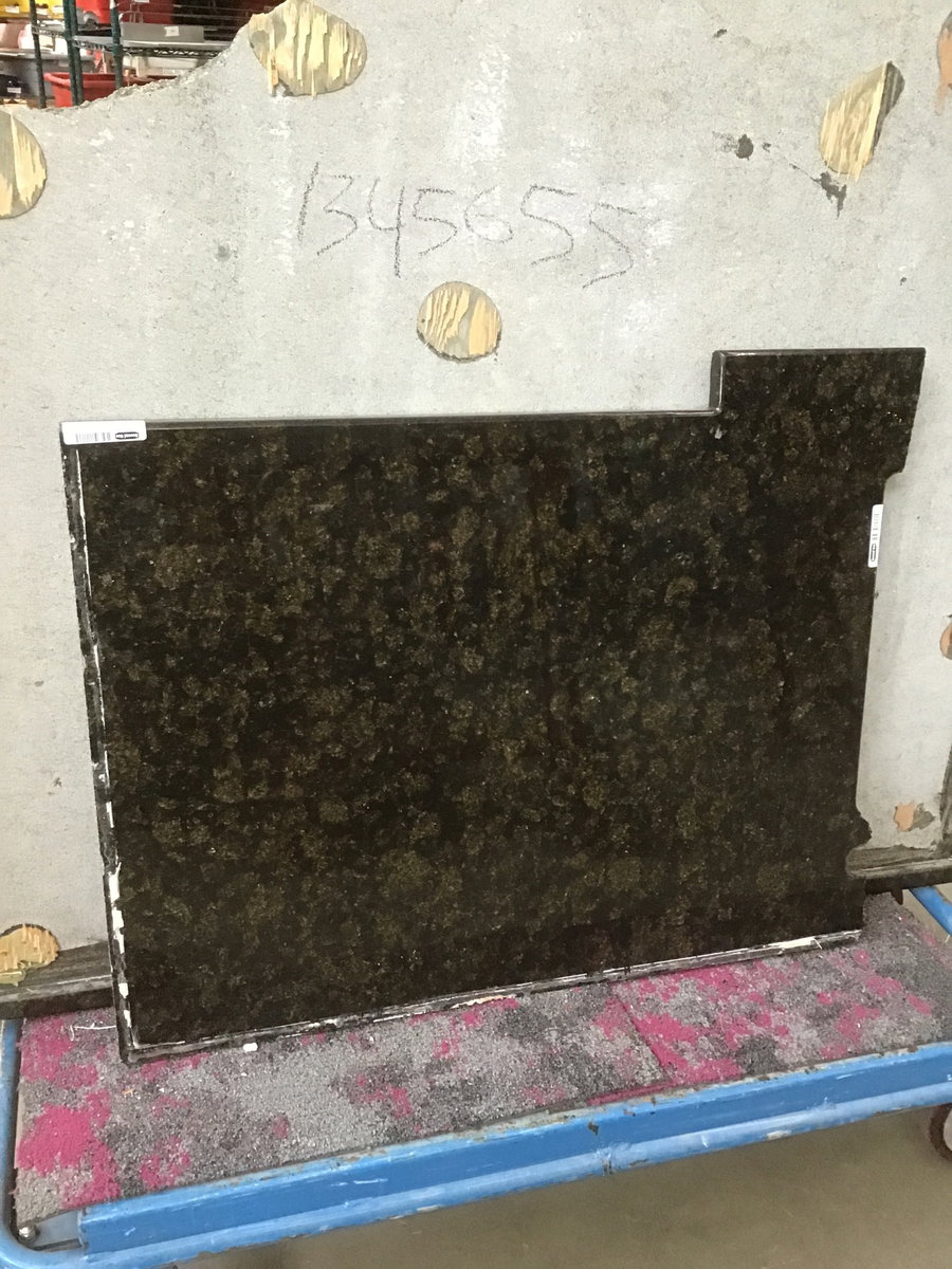A slab of granite countertop in a dark black tone with flecks of gold color throughout. Based on its shape, it looks like it was once on top of a kitchen island with a sink installed. There are a couple finished edges (one of them bullnosed) but neither extends across an entire side of the stone. Dimensional measurements listed refer to the dimensions of usable material, as some will need to be cut away for it to fit in your space.