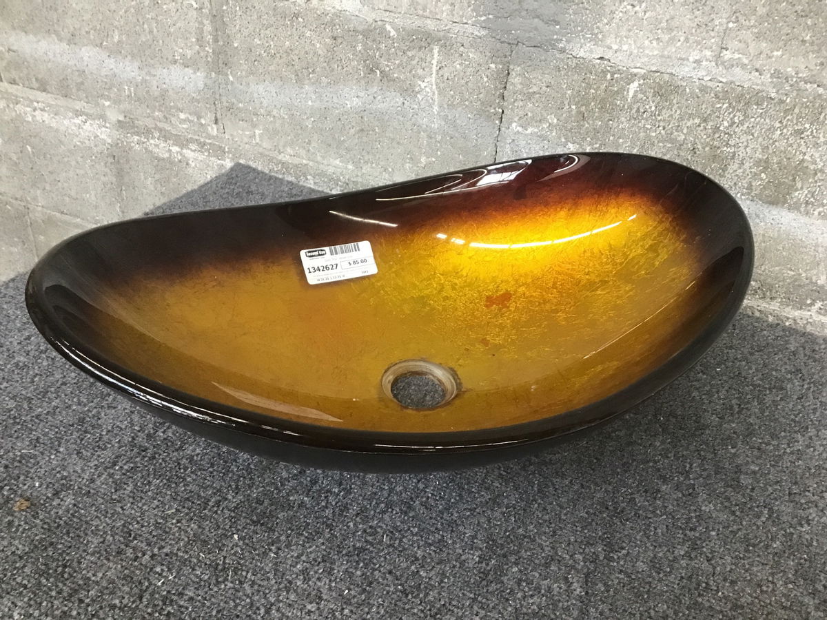 An oblong vessel sink that looks to be made of amber glass with a "gold foil" backing that gives it an impressive and regal vibe.