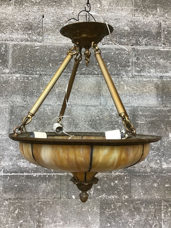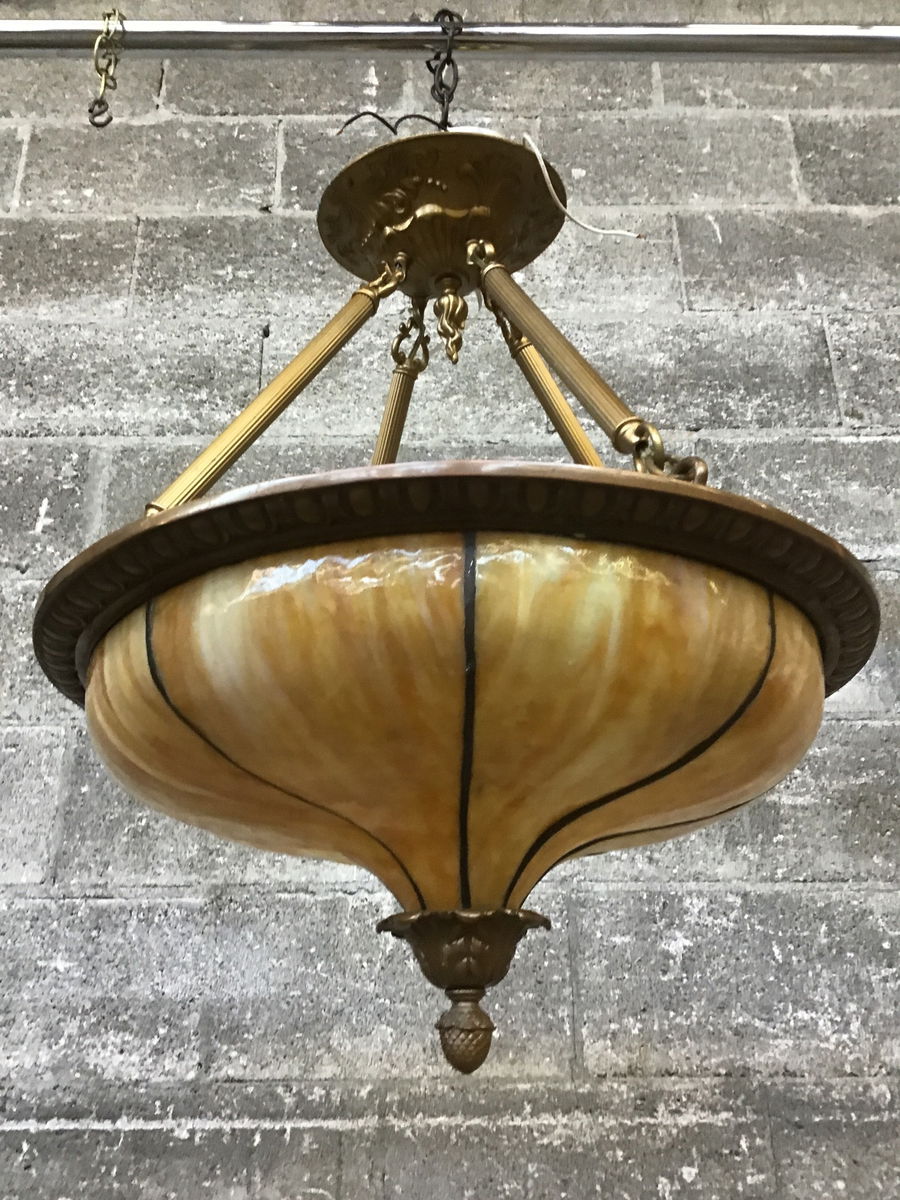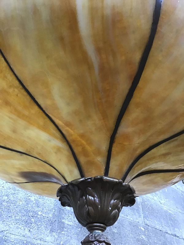 This classically-styled bowl chandelier appears to be a marriage between an older shade and reproduction canopy - which comes complete with new-ish wiring! The bowl is made of soldered panels of beautiful, butterscotch-y slag glass for a fantastic curvy shape. Two panels sadly have some damage (price reflects), though a skilled glassworker might be able to repair it.