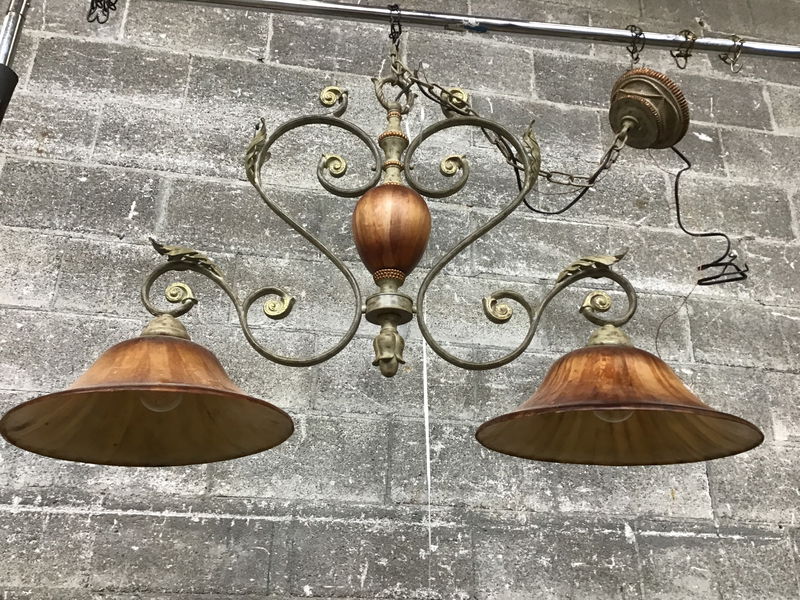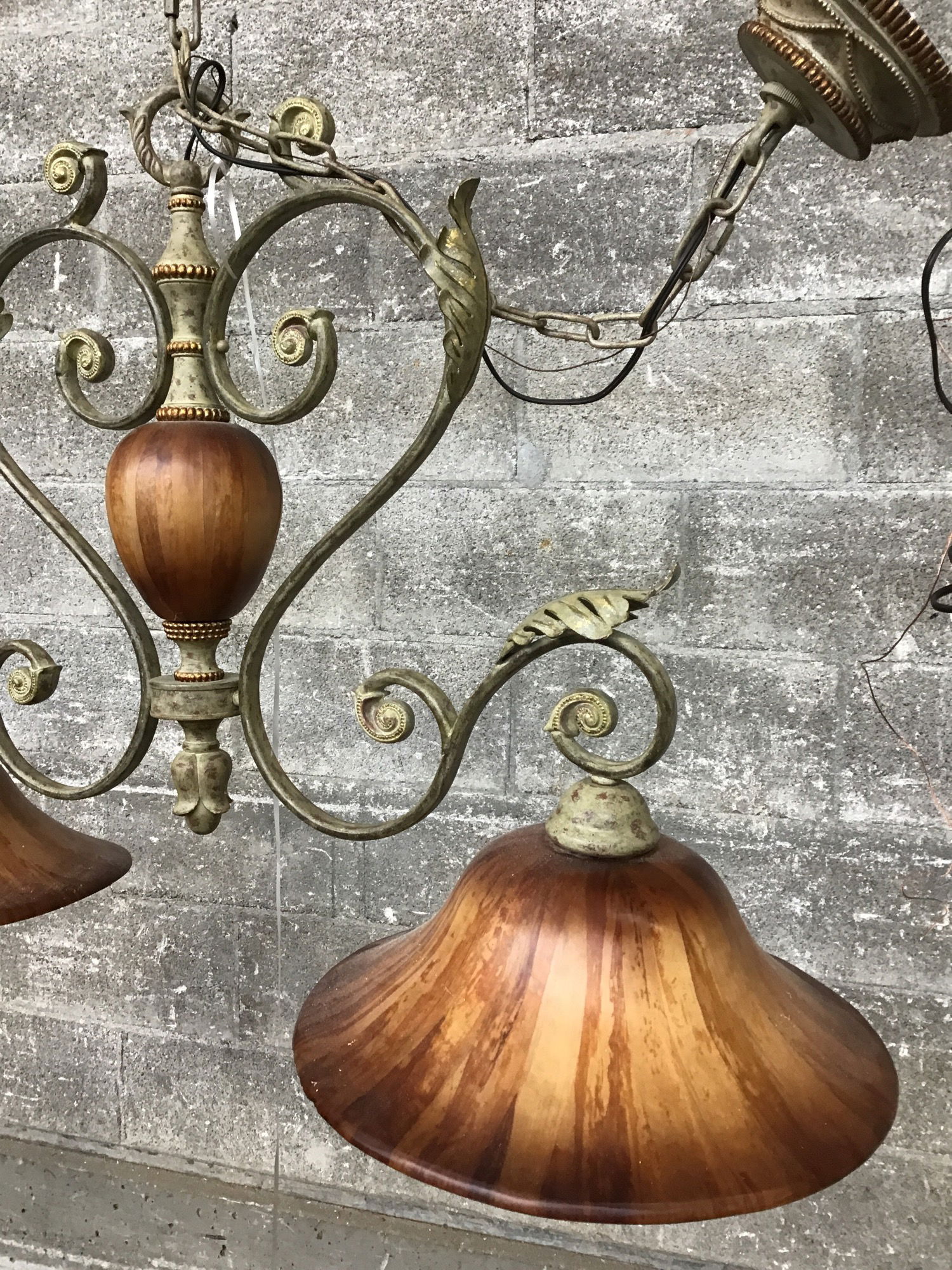 A rather fabulous Tuscan revival style chandelier with charming patinated bronze finish and unusual faux slag glass shades and column that appear to be fiberglass. They have a really cool streaky pattern that's kinda giving mushroom... Fit for a grand faerie palace methinks!