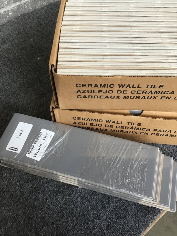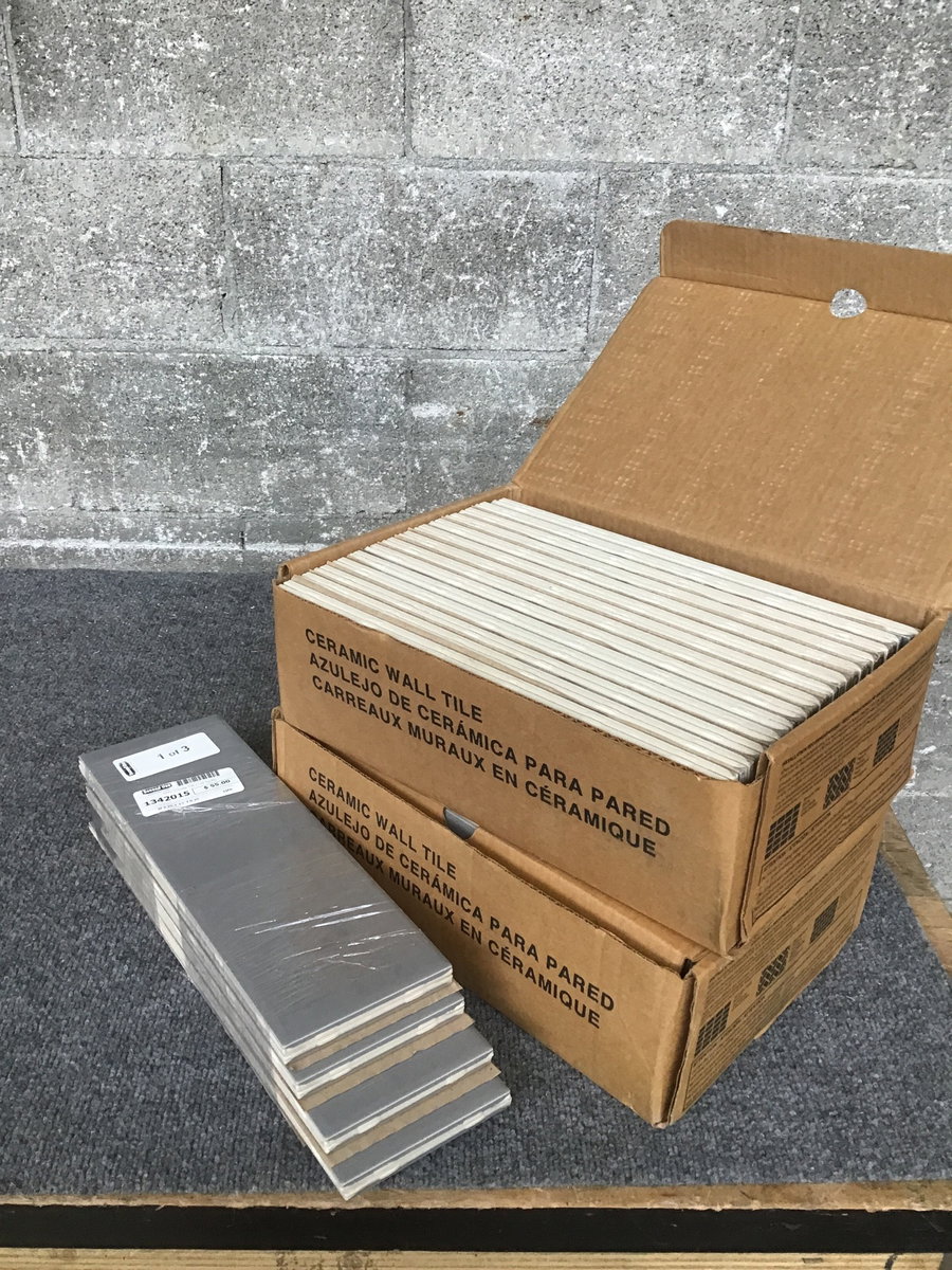 A lot of gray subway wall tile by Daltile, amounting to two full boxes and some change. Retails new for just under $70/box.
