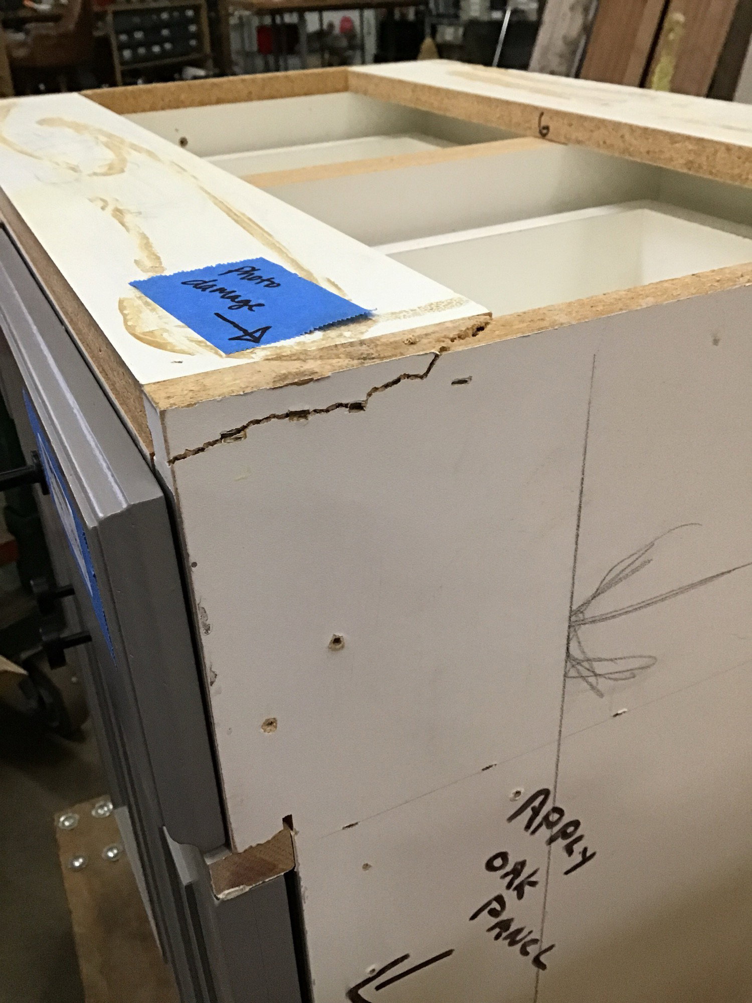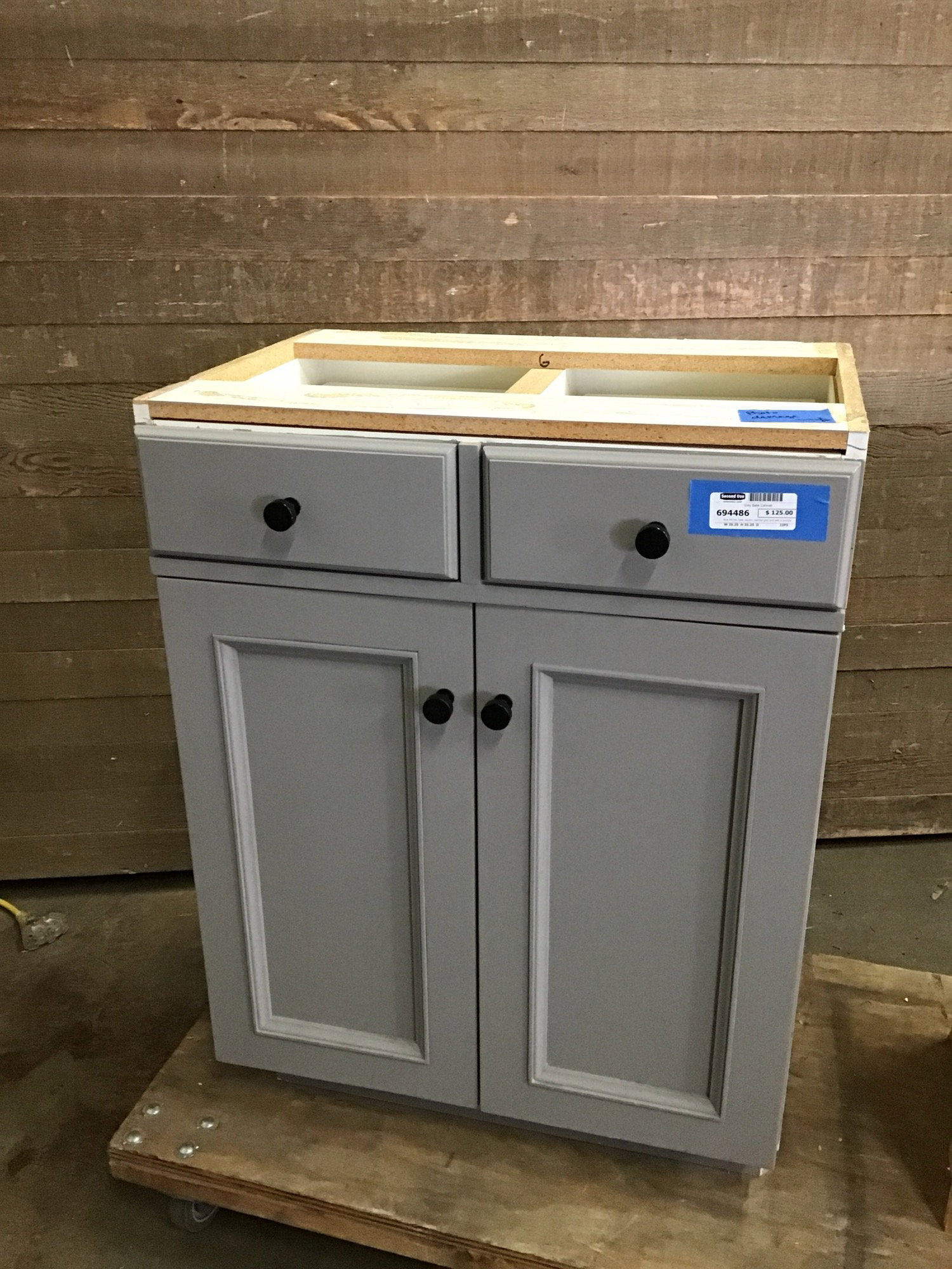 Nice kitchen base cabinet, painted grey and with a particle board box, and a little more shallow than most kitchen bases. Comes with two drawers, two doors, and two pull out shelves. There is a crack in the particle board on the right side, but once installed, it shouldn't cause issues. Price reflects.