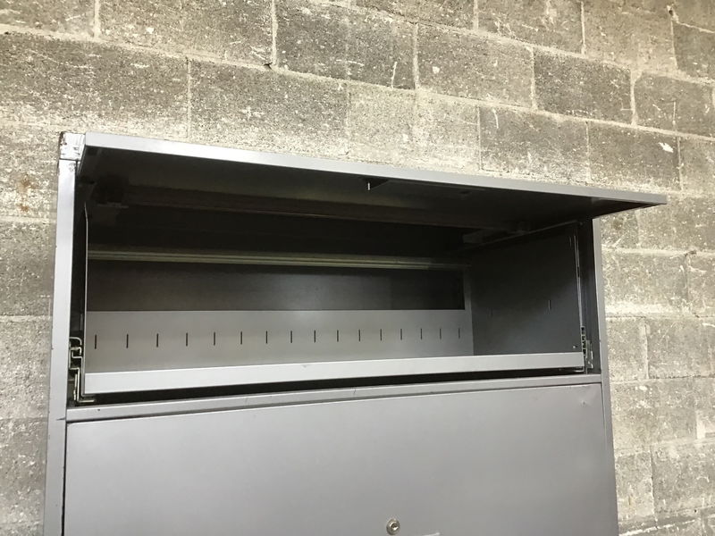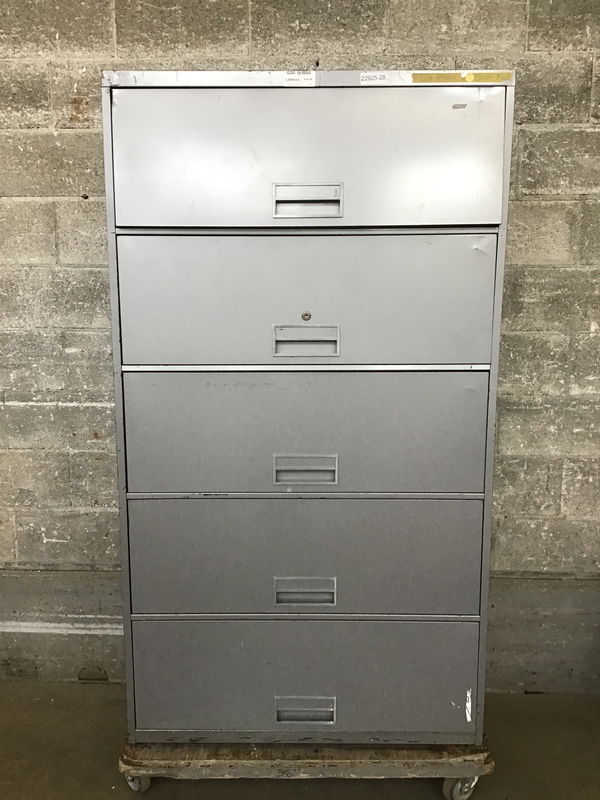 A grey steel file cabinet with five drawers- the kind with doors that swing up and slide into the cabinet so you can pull out the wide file drawer.