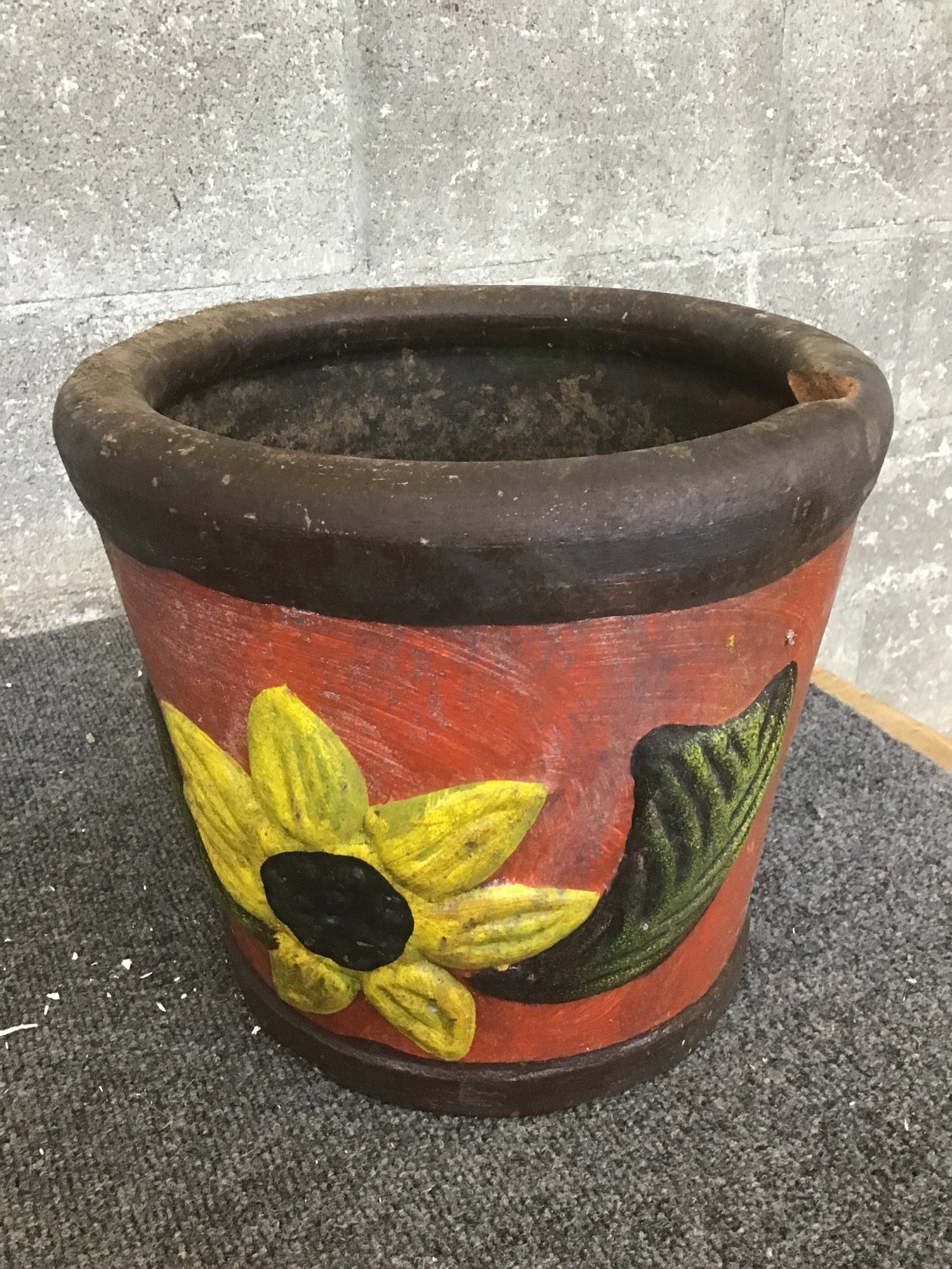 A good sized terracotta planter with a bright and cheery sunflower painted on each side. There's a decent chunk off the inner lip, but it won't affect the functionality for your plant babies!