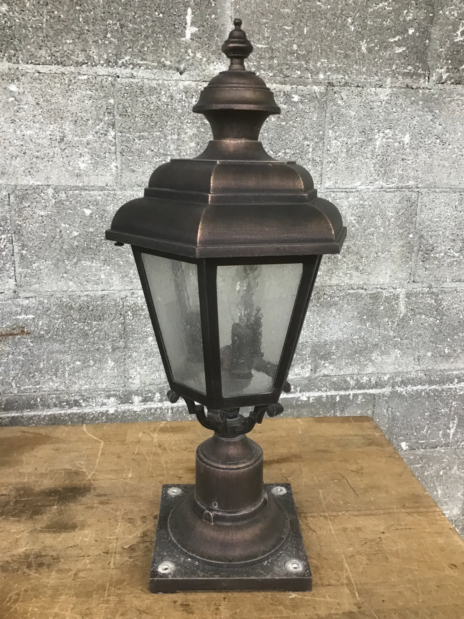 Outdoor post lantern with an aged brass finish and seedy glass. Photo may be representational.